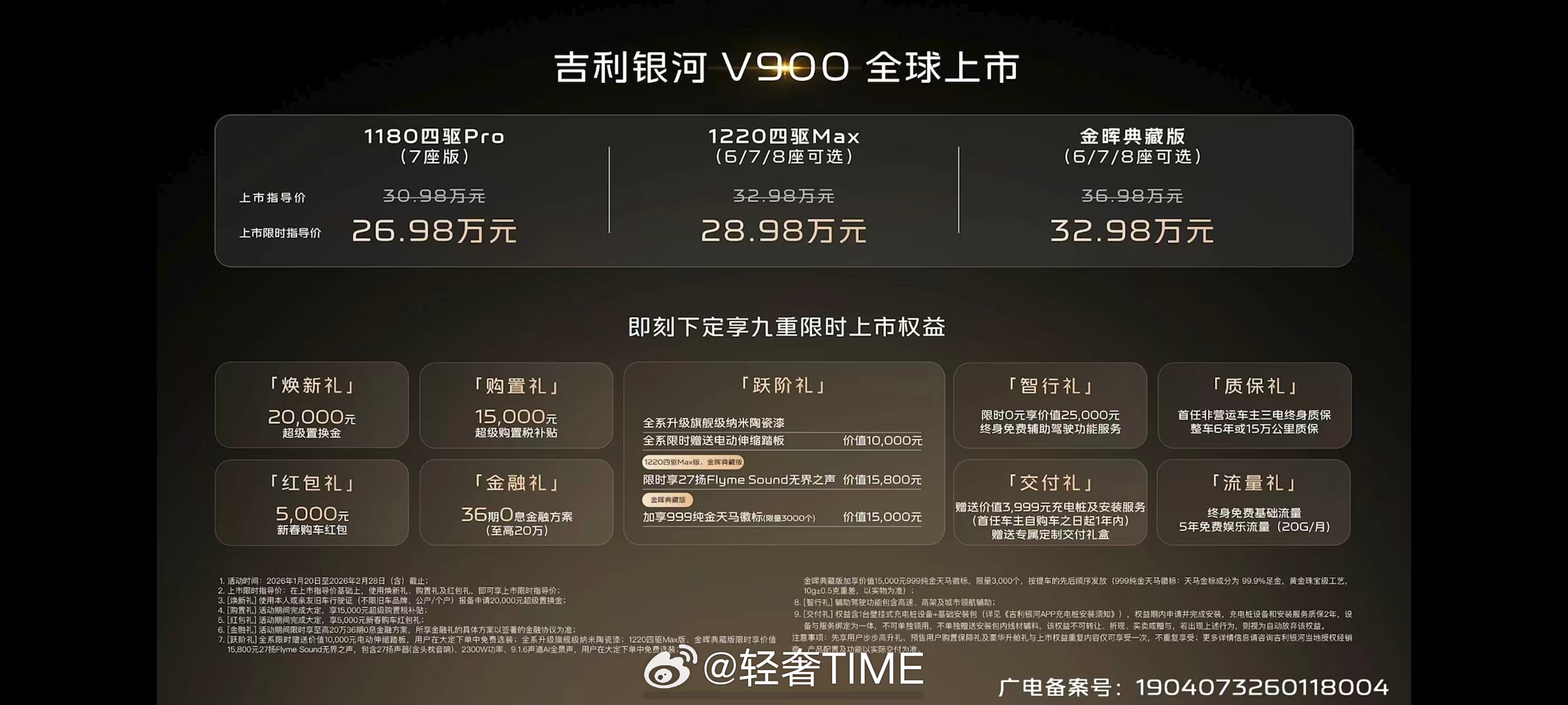 吉利银河V900全球上市26.98万起 1月20日,吉利银河V900正式上市,定位“AI全场景家庭旗舰MPV”,限时指导价26.98万元起。V900集满配实力于一身:超级AI增程技术实现1220km超长续航;91.8%超高得房率打造“三个1000+”宽奢空间;全系四驱配合路特斯调校,兼顾舒适与驾控;全球领先的11处气囊与“三排安全平权”设计,树立MPV安全新标杆;Flyme Auto 2智能座舱与全场景智能驾驶,让科技更具温情。