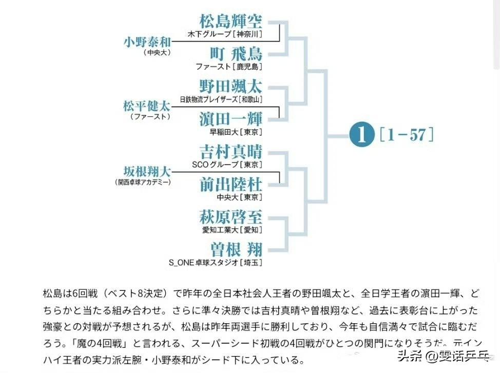 【桌球王国】距离2028年洛杉矶奥运会的选拔竞争已全面打响,松岛辉空冲击男单两连冠,谁将最终问鼎全日锦冠军? 全日本乒乓球锦标赛的赛季再度来临。2026年全日本乒乓球锦标赛的赛程已敲定:1月20日至25日,普通组与青年组的赛事将在东京体育馆展开角逐;1月29日至2月1日,三项双打项目的比拼则会移师至爱知县的丰田天空体育馆进行。今年的赛事依旧会围绕男女单打项目展开,届时必将上演多场高水平的精彩对决。 在去年的男单比赛中,当时还是高二学生的松岛辉空(木下集团队)斩获了个人职业生涯的首个全日本锦标赛冠军。夺冠之际,他的世界排名仅为第31位,在日本男队中位列第五。赛后接受《桌球王国》杂志冠军专访时,他曾立下目标:“希望在一年内将世界排名提升至个位数。”如今他已然兑现诺言,世界排名一路攀升至第8位,成功跻身日本男队第二号主力的行列。 另一边,在2024年全日本锦标赛上以惊天逆转之势夺冠的张本智和,凭借在WTT横滨冠军赛、WTT香港总决赛等赛事中的夺冠表现,始终稳居日本男队世界排名榜首(目前位列世界第5)。张本智和与松岛辉空双双跻身世界排名前十,成为本届赛事男单冠军的两大热门人选。紧随其后的夺冠竞争者同样实力不俗,包括曾两度夺冠、现征战德国乒超联赛的户上隼辅,以及在名帅邱建新的指导下状态回升的宇田幸矢等选手。 接下来,让我们按分区梳理一下各小组的种子选手与焦点球员。松岛辉空所在的第一分区,32名超级种子选手及焦点球员名单如下。 松岛辉空将在第三轮(1/8决赛,决出八强名额)中,遭遇去年全日本社会人组冠军野田飒太与全日学生锦标赛冠军滨田一辉之间的胜者。而在四分之一决赛中,他大概率会与吉村真晴、曾根翔等往届奖牌得主展开强强对话。不过松岛辉空在去年的比赛中曾战胜过这两位选手,想必今年他也会满怀信心地迎战。被称为“魔鬼第四轮”的超级种子选手首战(即第三轮),或将成为他卫冕之路上的第一道难关。值得一提的是,前全国高中生冠军、实力派左手将小野泰和也身处该分区的非种子选手行列。 向男单两连冠发起冲击的松岛辉空,所谓的“二年级魔咒”会与他绝缘吗? 全日本锦标赛常客曾根翔,正虎视眈眈地瞄准着冠军宝座。 第二分区是志在重夺男单桂冠的张本智和的赛区。在决定分区排名的第二轮比赛中,他将与去年的对手英田理志再度相遇。该分区汇聚了从老将到进攻型强手的众多实力派选手,但想要撼动张本智和的稳固地位,绝非易事。 作为日本男队的领军人物,张本智和剑指个人职业生涯的第三个全日本锦标赛男单冠军。 冈野俊介在上届赛事中首次闯入八强,在学生生涯的最后一年,他渴望再创佳绩、冲击更高排名。 第三分区堪称竞争最为激烈的“死亡之组”,云集了一众右手弧圈球进攻型强手。这里有2022、2023年男单两连冠得主户上隼辅,有希望实现连续三届跻身八强并更进一步的田中佑汰,还有谷垣佑真、德田干太、吉山僚一等在学生乒乓球界声名赫赫的顶尖选手。除此之外,最受瞩目的当属以16岁之龄斩获去年世界青年锦标赛U-19男单冠军的川上流星,他的实力已然达到冠军热门的水准,这样的评价毫不夸张。 进攻爆发力毋庸置疑的谷垣佑真,今年能否掀起一阵青春旋风? 在德国乒超联赛磨砺球技的户上隼辅,正渴望重返全日本锦标赛的冠军之巅。 川上流星——本届赛事最大的焦点新星之一,世界青年U-19男单冠军。 最后来看第四分区,该分区集结了众多实力派左手将选手,包括上届赛事男单亚军筱塚大登、2020年男单冠军宇田幸矢,以及小林广梦、吉山和希等名将。倘若能上演上届季军筱塚大登与去年下半年在国际赛事中表现亮眼的宇田幸矢的强强对话,必将极具看点。值得关注的还有效力于德国乒超联赛的横谷晟,他同样拥有不容小觑的强劲爆发力。 上届赛事斩获亚军、前届赛事位列第三的筱塚大登,今年能否成功登顶冠军宝座? 世界排名稳步回升的宇田幸矢,期待在赛场上展现自己标志性的超强进攻爆发力。 2026年,距离2028年洛杉矶奥运会的选拔竞争已全面打响。继去年的松岛辉空之后,本届全日本锦标赛的冠军得主能否借此契机实现职业生涯的飞跃?让我们拭目以待。 2026.1.20