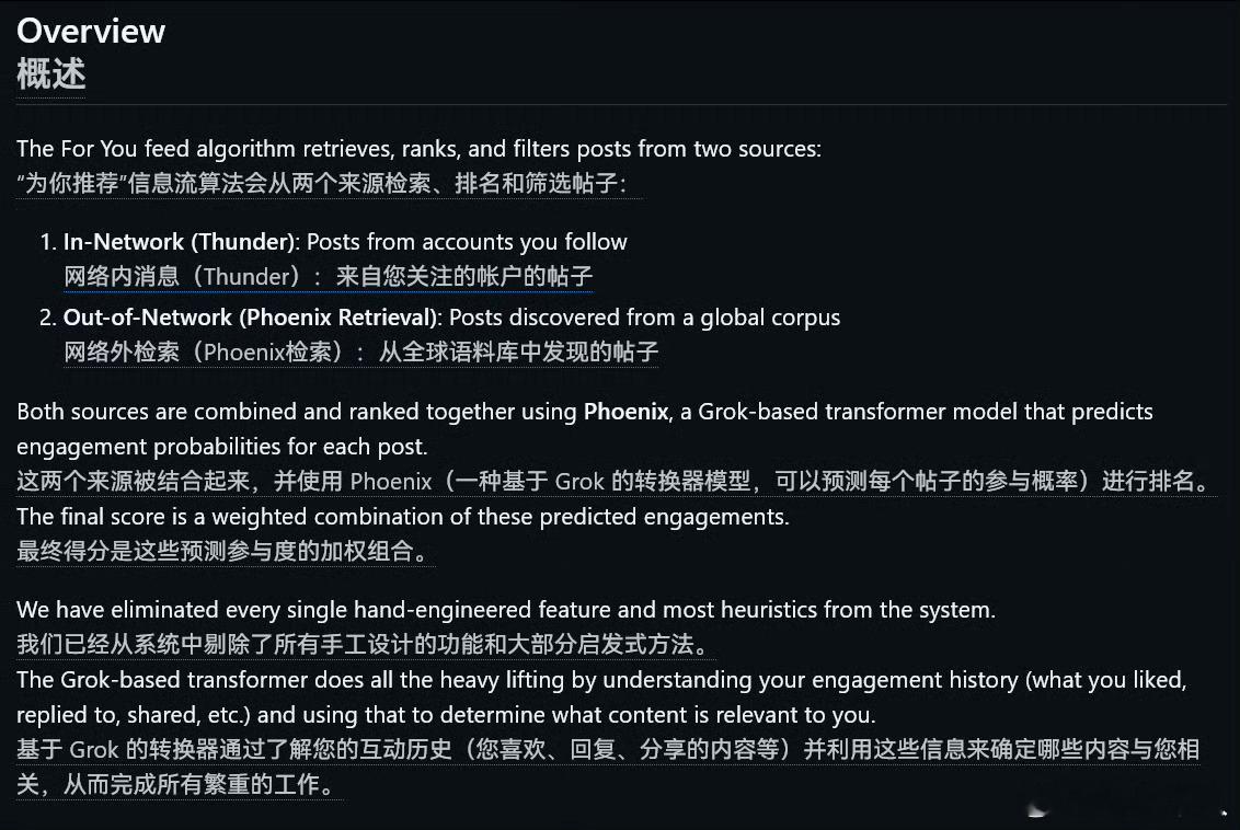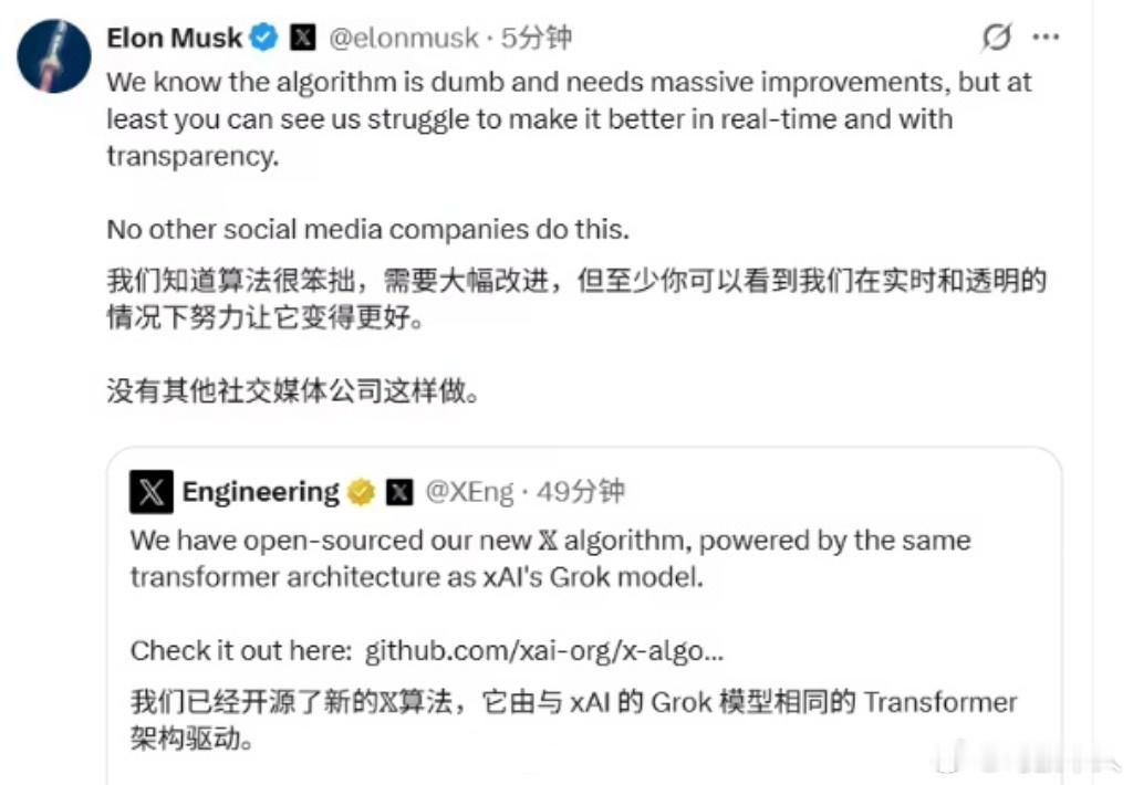 马斯克又开源了!X平台正式开源推荐算法,马斯克回应X平台公开推荐算法 说:我们知道算法很笨拙,需要大幅改进,但至少你可以看到我们在实时和透明的情况下努力让它变得更好,没有其他社交媒体公司这样做!X的工程师团队确认了,说X平台开源算法4周更新一次,地址在:github.com/xai-org/x-algorithm截至目前,马斯克已经开源了自家AI Gork-1的专家模型、许可和基础架构、AI百科、特斯拉所有的电动汽车专利、部分FSD算法模块(包含感知、规划、控制等片段)、Hyperloop超级高铁的设计方案和原理,包括真空管道、磁悬浮、低阻力车厢登核心技术……