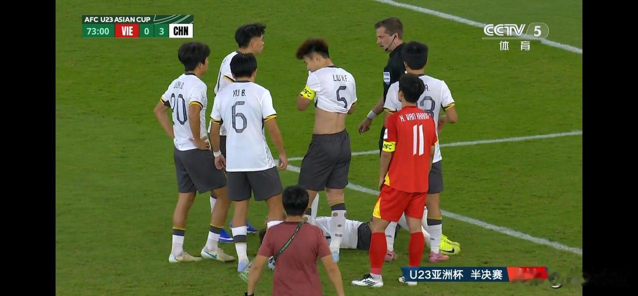 3:0,U23国足直接杀死了比赛!77分钟的时候,U23国足定位球直接吊门,破门入网!3:0领先越南国足!并且罚下一名越南队员范里德!这样基本上确保了国足进决赛了! 第三个进球回看以后吹了越位!目前比分还是2:0