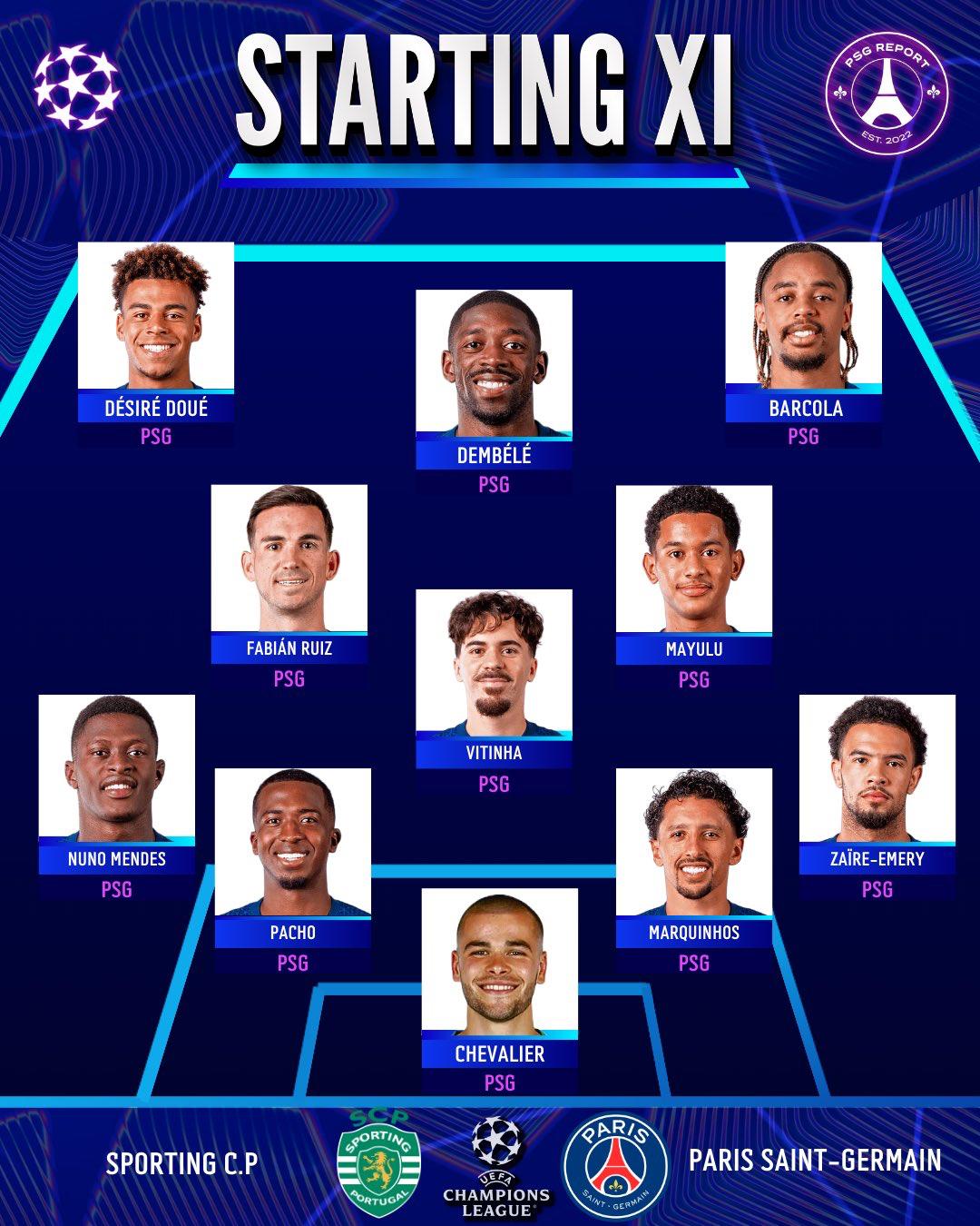 葡萄牙体育VS巴黎圣日尔曼首发:登贝莱领衔,维蒂尼亚出战