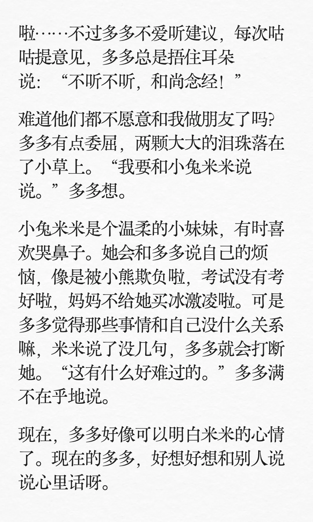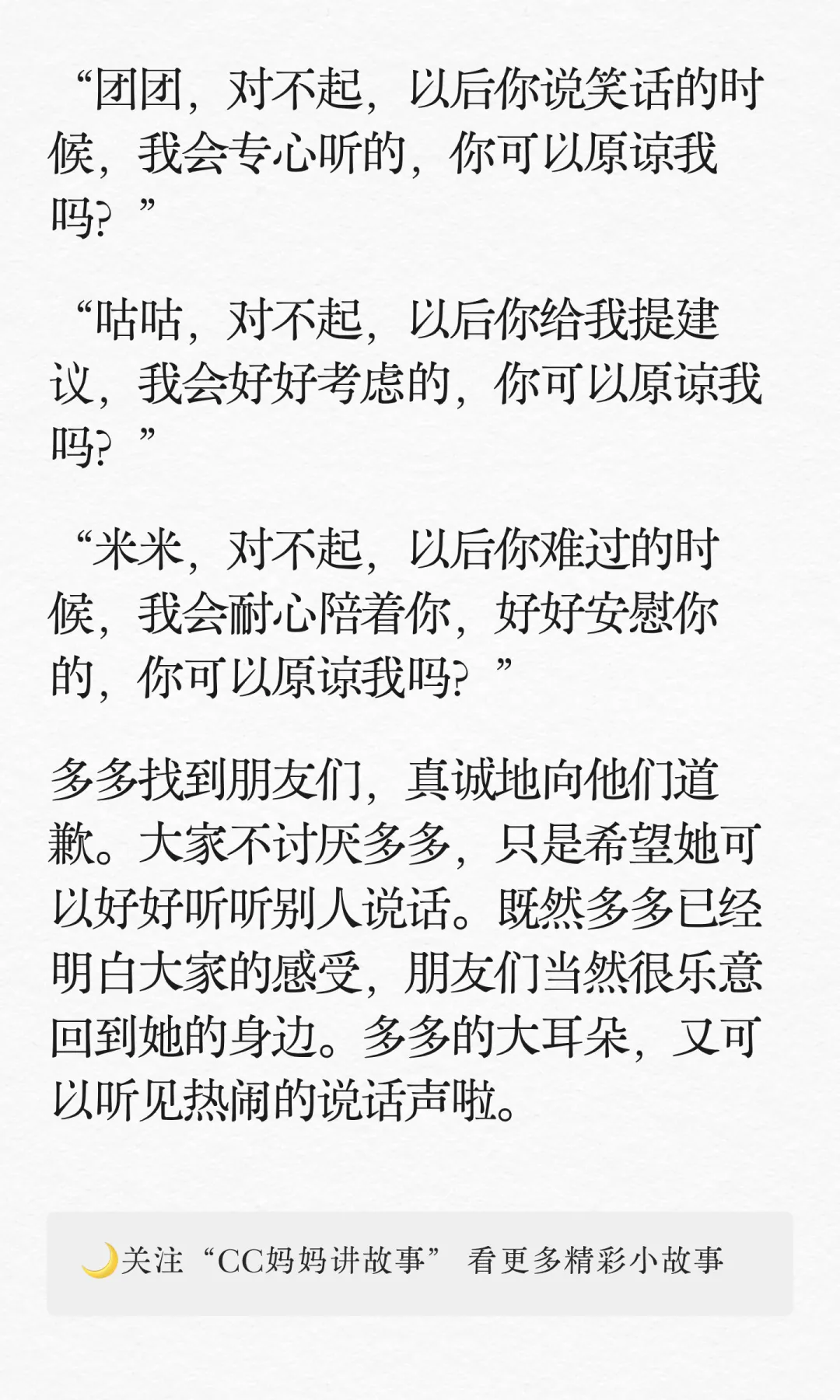 [星R]今天这个故事是想和宝贝说,当别人和我们说话的时候,要专心听哦,这是尊重别人的表现,也可以让我们从别人的话里学习到智慧。 [黑薯问号R]那为什么需要尊重别人呢?因为我们也需要别人的尊重呀[亲一个R]我们也希望别人认真听听我们说话,对吗? [晚安R]各位大宝贝小宝贝晚安~好梦~ [私信R]文字内容是本人原创,页面图画包含AI生成素材。