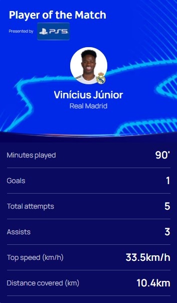 本场比赛,维尼修斯首发出战,打进1粒进球,送出3次助攻,还有7次关键传球,4次过人成功。
