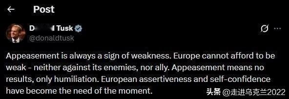 图斯克尖锐批评欧洲的让步 图斯克对欧洲的妥协态度发表严厉批评。 波兰总理图斯克在 X 平台上发表尖锐声明,警告欧洲,在面对盟友和敌人时不要表现出软弱。他认为,政策上的让步不仅无法换取结果,反而会招致羞辱。 核心观点: • 拒绝平庸的妥协:图斯克强调,顺从与退让始终是软弱的表现。欧洲无论是在面对敌人还是盟友时,都承担不起软弱的代价。 • 以实力求生存:他坚信,欧洲唯有展现出力量与自信,才能在现代挑战中捍卫自身利益,避免在世界舞台上溃败。 此前,图斯克强调:“是俄罗斯拒绝了美国制定的和平计划,而不是泽连斯基。” 曾点名指出破坏乌克兰和平进程的真正元凶。与此同时,波兰总统纳夫罗茨基也表达了相似立场,认为普京不可信任,且尽管华盛顿方面近期言论存在变数,但没有美国的参与,欧洲安全将无法实现。