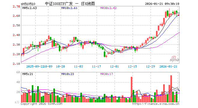 1月21日,中证500ETF广发(510510)开盘跌1.14%,报2.600元。中证500ETF广发(510510)重仓股方面,胜宏科技开盘跌0.24%,华工科技跌1.10%,先导智能跌1.21%,芯原股份跌1.22%,巨人网络跌0.02%,指南针跌0.35%,卧龙电驱跌0.89%,赤峰黄金涨2.97%,通富微电跌0.02%,欣旺达跌0.66%。