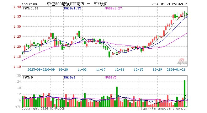 1月21日,中证500增强ETF南方(560100)开盘涨0.00%,报1.366元。中证500增强ETF南方(560100)重仓股方面,胜宏科技开盘跌0.24%,金力永磁跌1.36%,兴森科技跌1.19%,高德红外跌0.70%,先导智能跌1.21%,瑞芯微跌0.89%,华工科技跌1.10%,拓荆科技跌1.08%,拓维信息跌0.78%,生益电子跌1.39%。