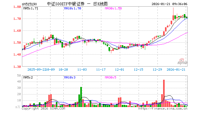 中证500ETF中银证券(515190)业绩比较基准为中证500指数收益率,管理人为中银国际证券股份有限公司,基金经理为张艺敏、刘先政,成立(2020-04-30)以来回报为71.61%,近一个月回报为14.90%。