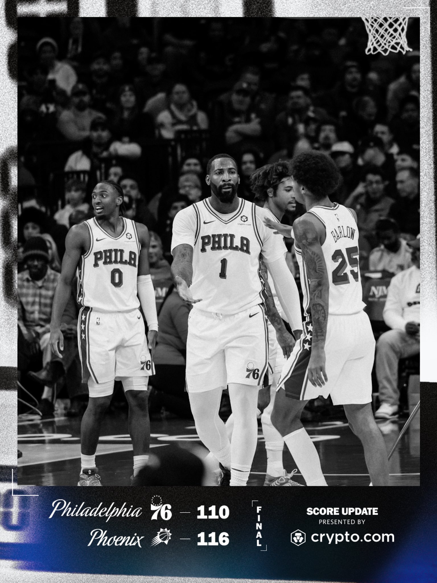 发挥不佳!全场比赛结束:76人队主场背靠背110-116不敌太阳队!埃奇库姆25分7篮板2抢断,乌布雷21分4篮板2抢断,马克西20分7助攻3抢断,格兰姆斯12分4篮板5助攻3抢断,德拉蒙8分15篮板,博纳11分10篮板3封盖,巴洛8分5篮板!76人队下一场比赛将于1月23日周五主场迎战火箭队~费城76人冬日热情篮不住76人vs太阳