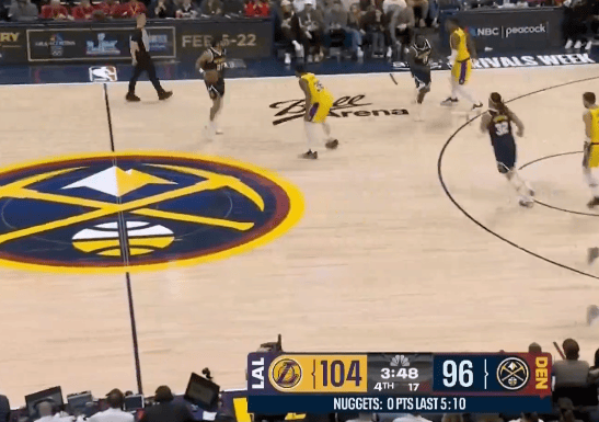 第四节比赛中,哈达威三分投出三不沾,掘金已经6分钟不得分落后湖人8分。