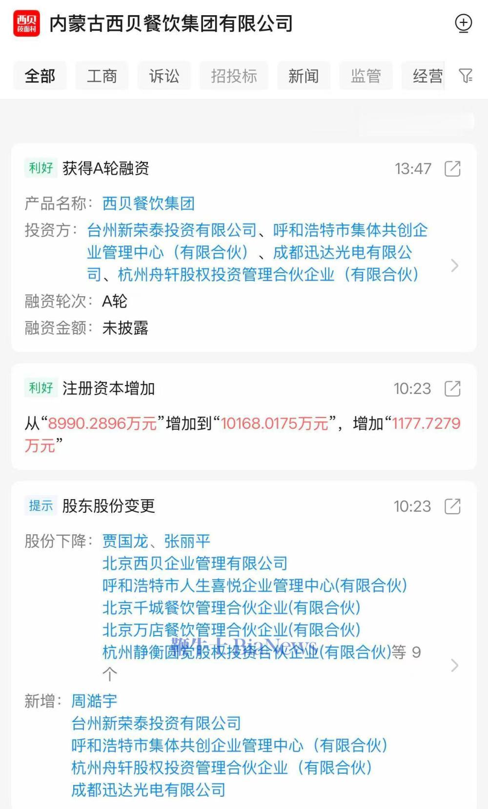 1月21日,天眼查信息显示,内蒙古西贝餐饮集团有限公司获A轮融资。投资方包括台州新荣泰投资有限公司、呼和浩特市集体共创企业管理中心(有限合伙)、成都迅达光电有限公司、杭州舟轩股权投资管理合伙企业(有限合伙)等,融资金额未对外披露。