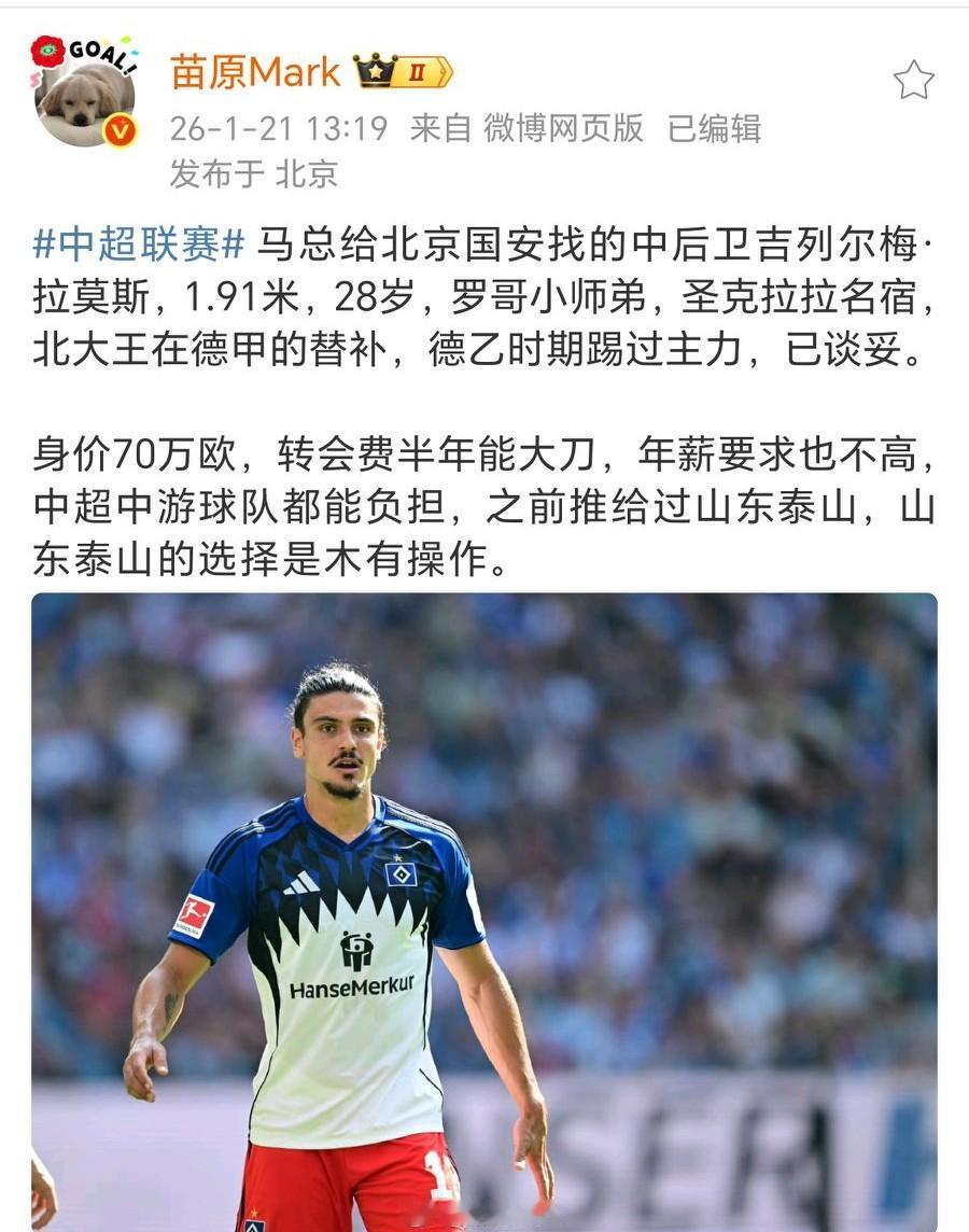 名记苗原:加盟国安的外援之前推送给山东泰山队 1.91米,28岁,中后卫将加盟北京国安,之前被推送给山东泰山队,泰山队没有操作。根据外媒《图片报》报道,该球员的合同仅剩半年,转会费只有10万欧。 这个价格基本和方昊留给国安的转会费差不多,价格方面和薪水方面应该都不会太高。 国安上赛季冲冠失败,这赛季换了管理层,换了教练团队,外援也是最重组,本赛季看起来又是要磨合队伍的一年了。北京国安