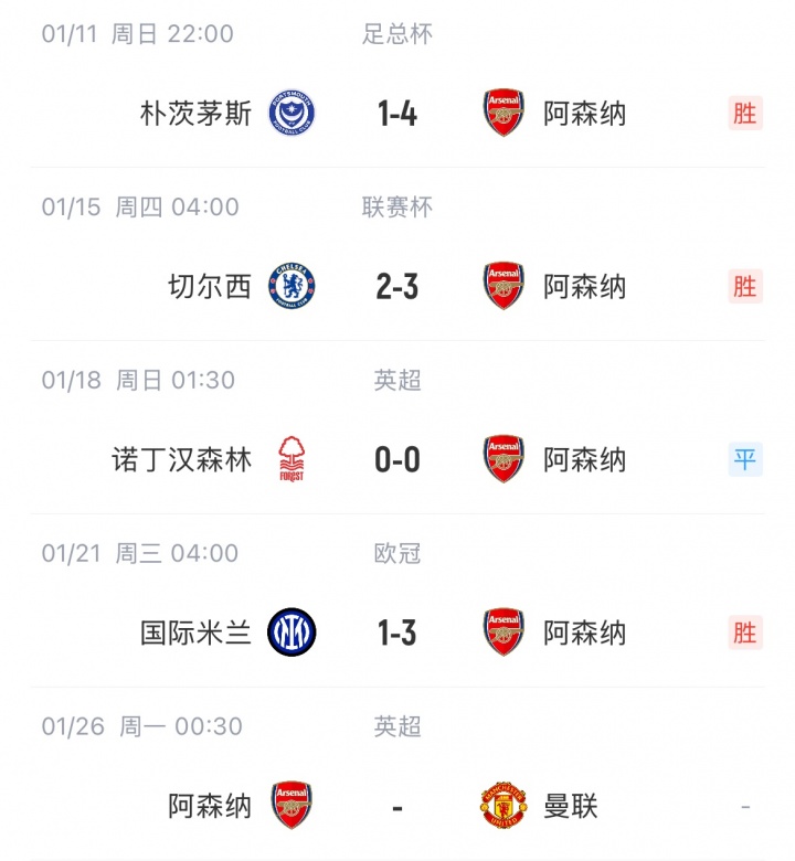 接下来,阿森纳将在英超回到主场,北京时间1月26日00:30,阿森纳将迎战曼联。