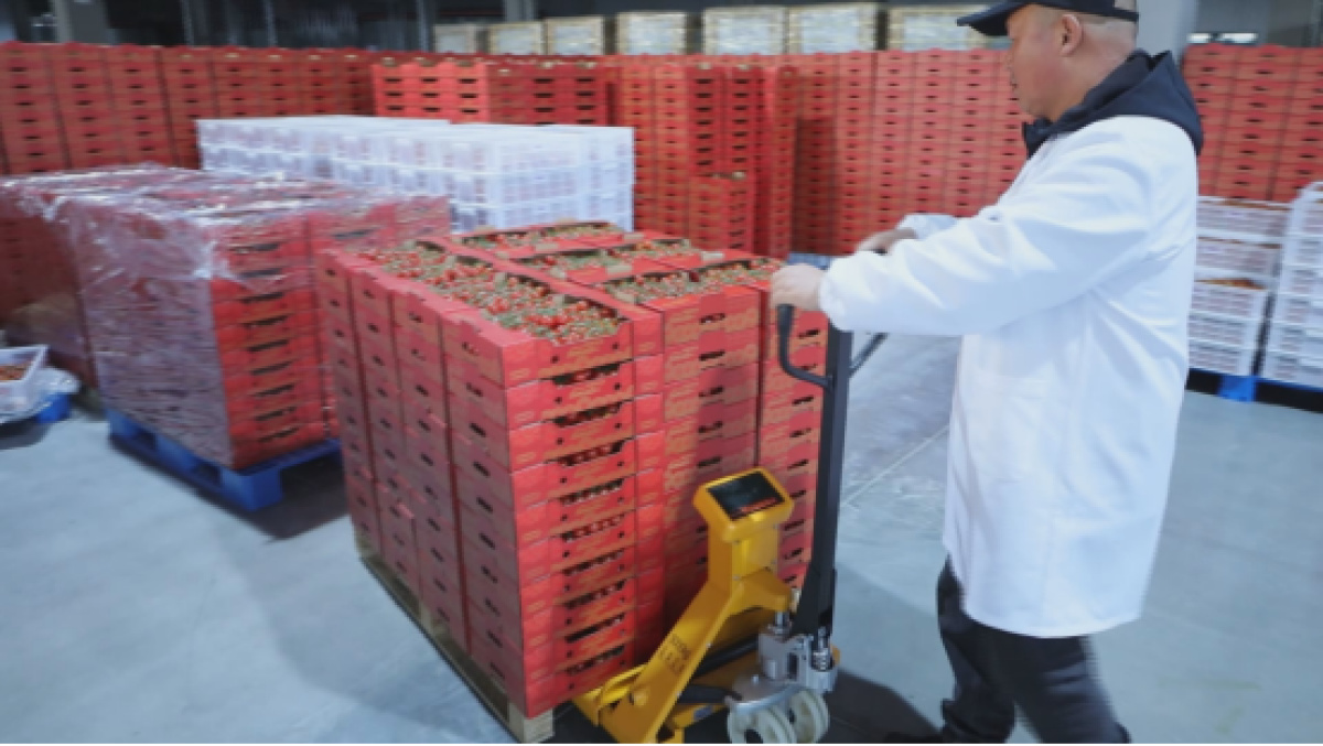 在信阳市潢川县水木光州农业科技装备园区内,一排排番茄架上,像挂了一串串迷你灯笼,每一颗圆滚滚的番茄都透着饱满诱人的光泽。工人们动作娴熟地将一颗颗果实采收下来,装入周转篮,然后进行包装销售。