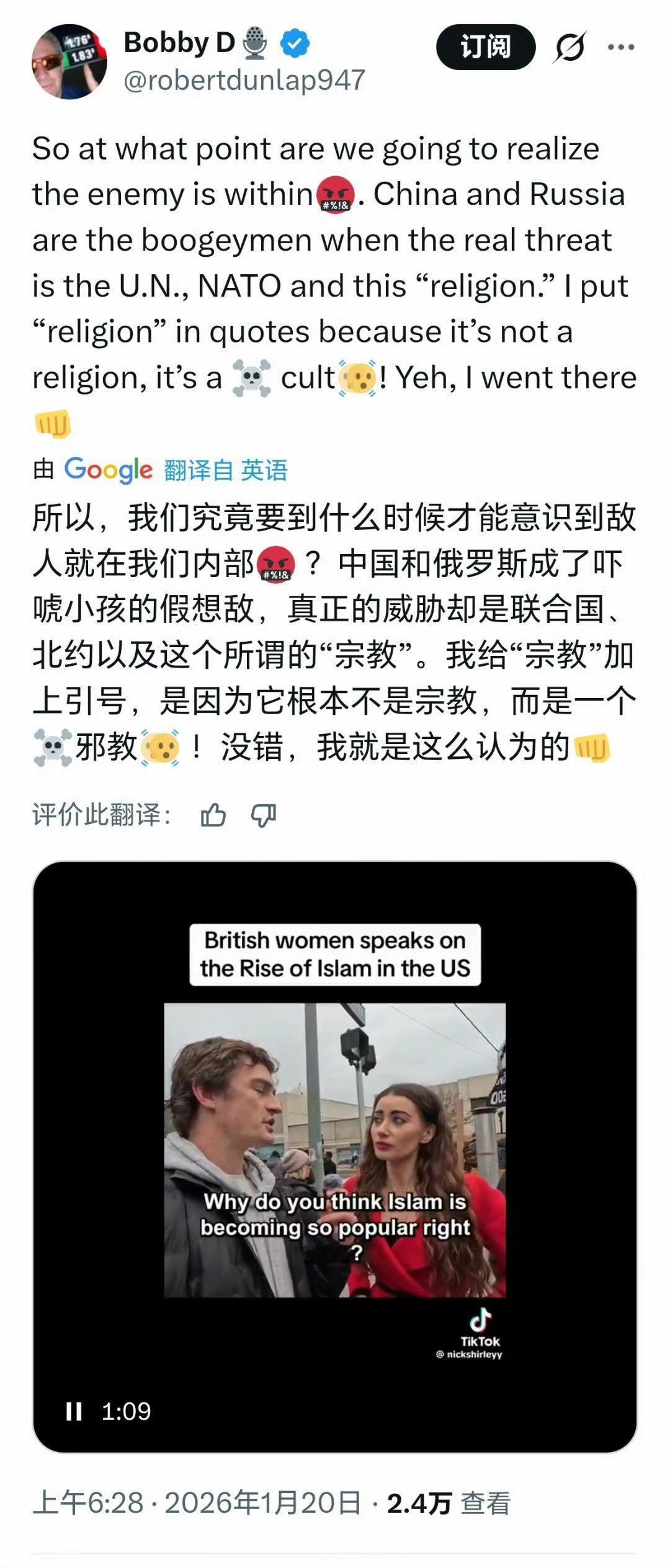 特朗普转发鲍比的帖子,声称俄罗斯和中国不是敌人,可真正的威胁其实是联合国、北约。