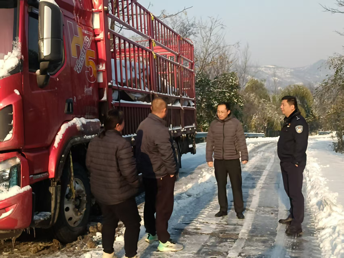 据了解,1月19日17时许,一辆外地送货车辆行驶至武庙集镇锁口村坳口组附近时,因持续降雪导致路面湿滑泥泞,车辆陷入进退两难的困境。驾驶员多次尝试自行脱困,但因路面湿滑、地形复杂而未能成功。1月20日9时许,村干部在对村内主次干道及偏远路段开展铲雪除冰作业时,发现被困车辆和人员。