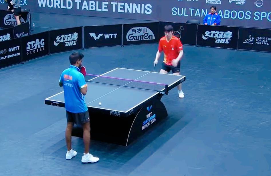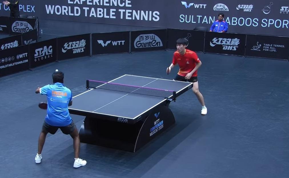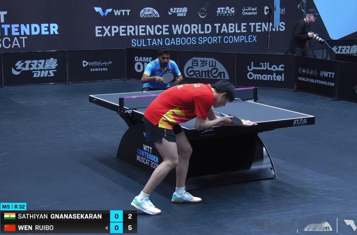 被温瑞博笑死了! 印度小哥, 刚要开球, 温瑞博突然跳了两下, 看这架势, 就是要拼对拉了。 自从4:3赢了雨果之后, 小温打的很自信呀。 搞得自己不想打台内了, 摆开架势打相持, 不过这印度小哥有些弱, 温瑞博还没对拉就已经7:2领先了。 最后11:6拿下