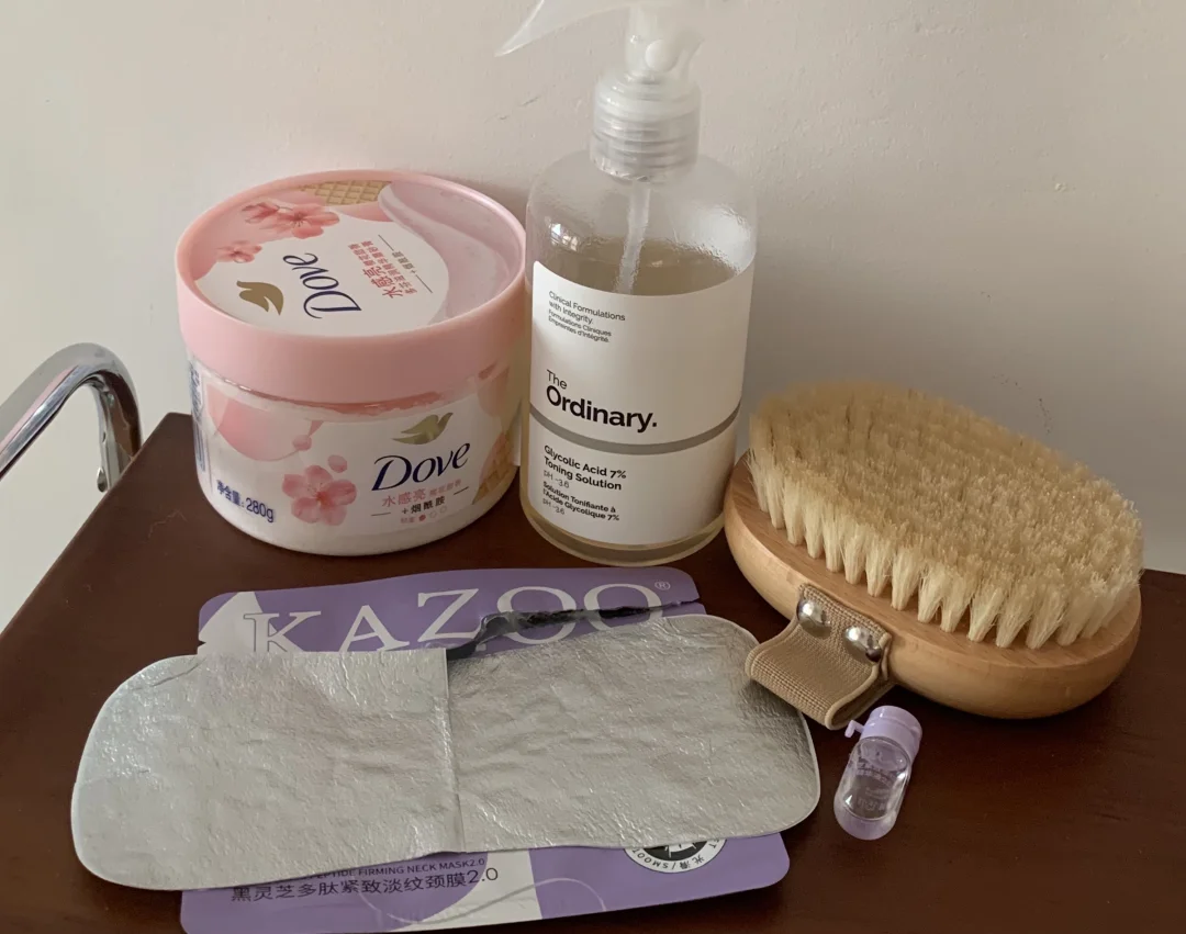 1️⃣洗澡前第一步涂磨砂膏,个人喜欢配合干刷,从脖子下方向上刷到耳后,再带到左右肩胛骨(注意力度别太大)刷完再去摸脖子就已经是相对平滑且没什么颗粒的状态了