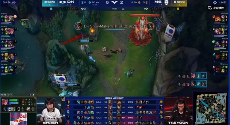[11:14]SMK卡牌再次发力,大招抓下配合队友强杀没有净化的Taeyoon卡莉斯塔,这波DK四人打出0换2,回头拿下第二条小龙!DK反而领先了1500块了!