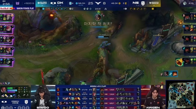 [13:30]DK捷报频传!上路Siwoo亚恒越塔交大对位单杀没有闪现的Kingen纳尔,下路2V2,NS想动手但是被Career娜美一个水泡直接卡住,Smash卢锡安交大反打,这波反而是Taeyoon卡莉斯塔被反杀!DK再打一波0换2!