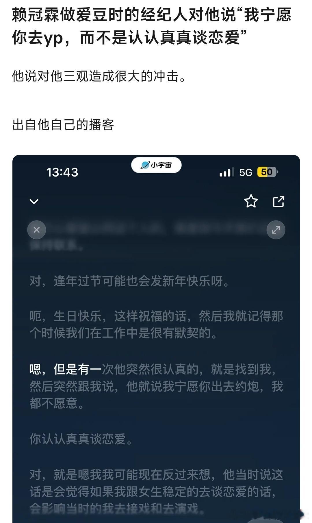赖冠霖经纪人不愿意他认真恋爱认识他是在韩.团选秀,再次见到他是退.圈声明,三观正的人可能真的不适合这个圈子。我觉得赖冠霖是一个很爱思考的人,他对自己的人生有自己的见解,并且他喜欢感受生活,喜欢落地大于云.端。因为不想被定义,被贴上各种标签,所以他“跳出系统”,不再做别人的提.线.木.偶!真的好有勇气,并且成长得飞快,现在的他也许没有偶像时期年轻精致,但内在提升,气质更成熟。他的决定也是出于对自己的考虑和对未来的规划,选择另一个赛.道重新奋斗,或许会更自由吧。