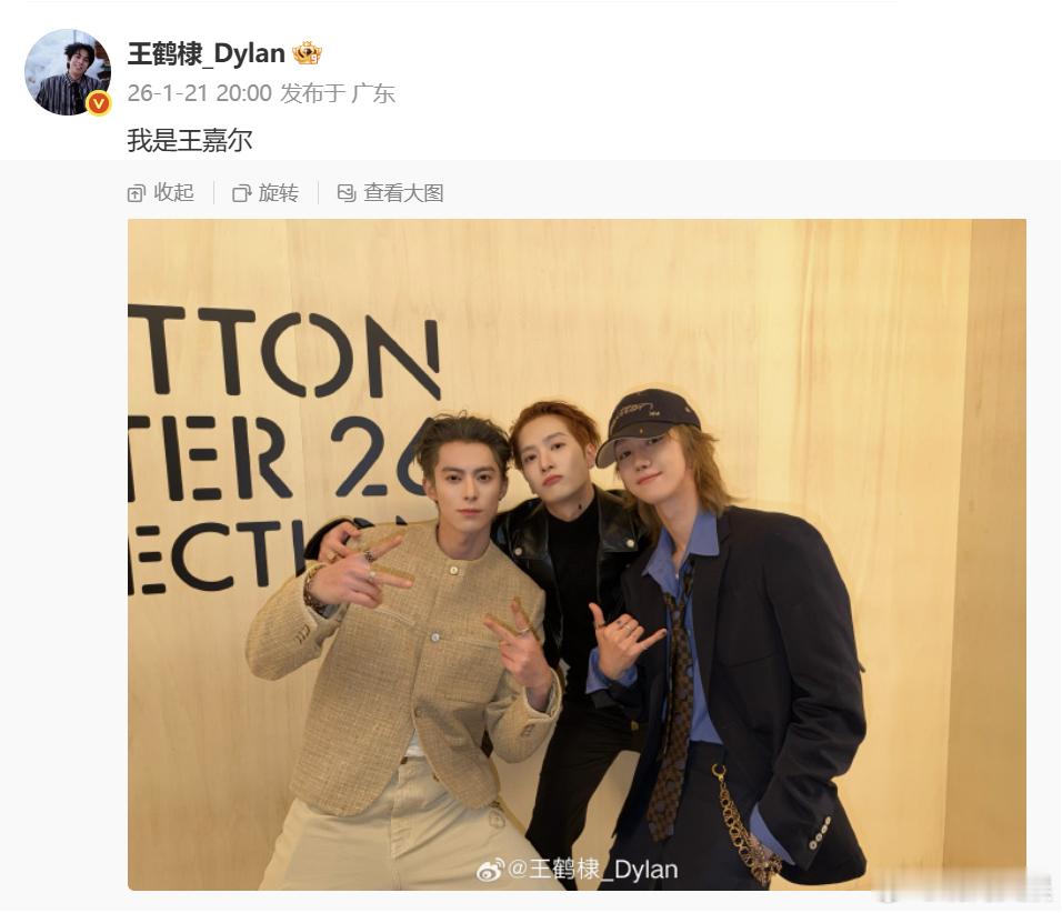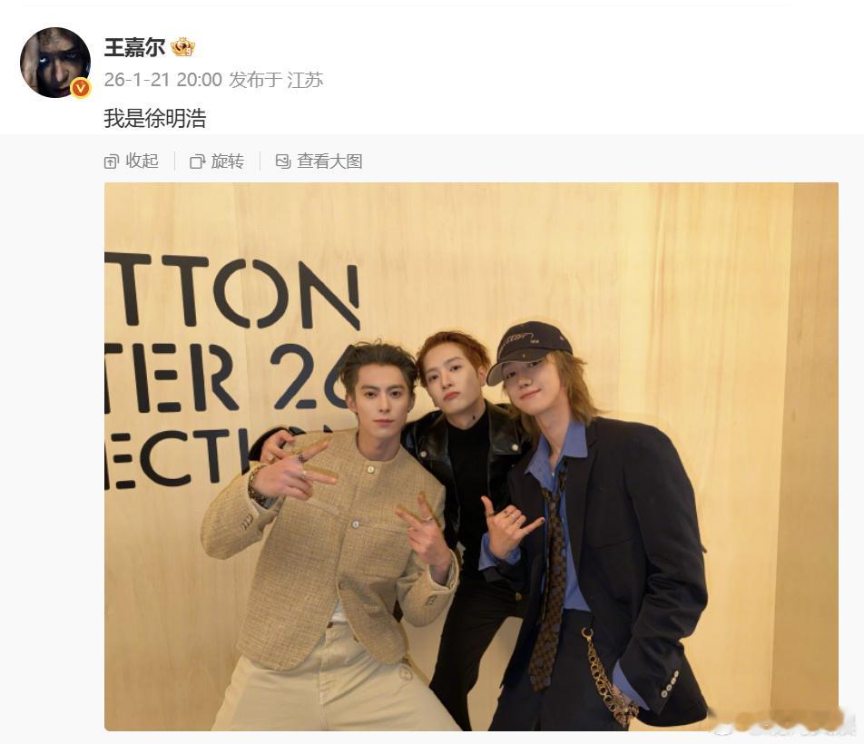 王鹤棣王嘉尔徐明浩同框合照21日晚,、、一起发了三人合照,还互相“冒认”身份 王