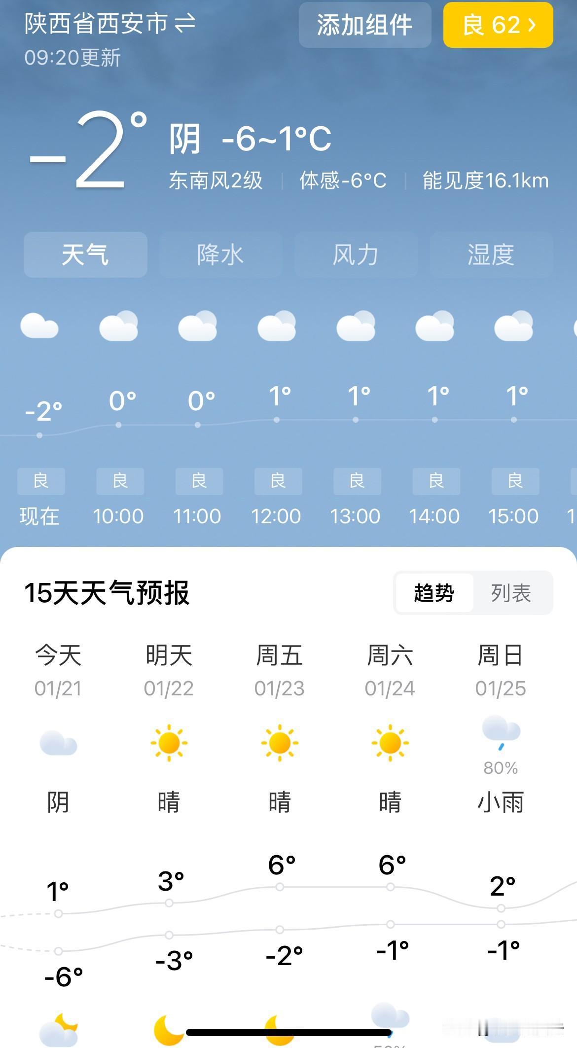 今天是1月份最冷的一天, 户外气温零下6摄氏度 人体体感温度零下6摄氏度, 昨天是大寒节气, 今天是大寒第二天, 西安市区最高温度仅有1摄氏度 从明天开始,寒潮将逐渐消退, 气温开始逐渐回升。