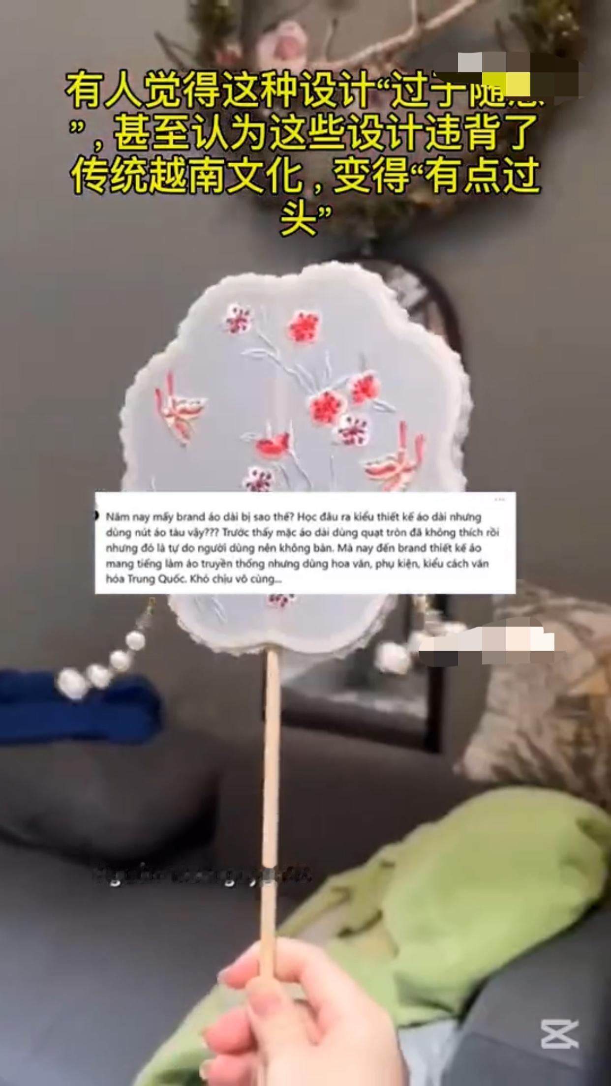 越南的争议话题:越南的奥黛商家正在大规模抄袭旗袍盘扣和布料花样,并且挪用中国团扇等各种配饰,将之变为“越南文化文符号” 。
