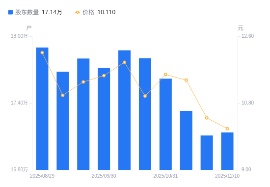 日期A股户数(户)流通A股户均持股数(股)户均持股市值(万元)2026-01-2015487114884.6716.762025-12-1017136413452.0913.602025-11-2817108913473.7114.012025-11-1017329713302.0415.192025-10-3117619013083.6315.142025-10-2017804112947.6014.232025-10-1017874012896.9715.352025-09-3017718013010.5215.012025-09-2017800012878.7914.642025-09-1017682212964.5914.27