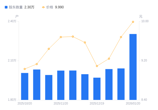 日期A股户数(户)流通A股户均持股数(股)户均持股市值(万元)2026-01-202303611780.3511.772026-01-092040713298.0012.872025-12-312035713330.6612.322025-12-191969913775.9412.522025-12-101996513592.4013.012025-11-282024613403.7512.992025-11-202023713409.7112.982025-11-101990513633.3712.872025-10-312032013354.9312.192025-10-202005913528.7012.22