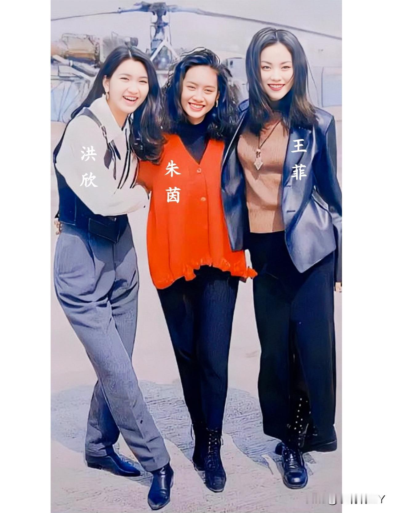 这是洪欣与朱茵和王菲在拍戏休息间隙的一张合影,拍摄于一九九二年。彼时洪欣二十一岁,朱茵二十一岁,王菲二十三岁,三人都处于颜值巅峰,要说谁最漂亮,难分高下。