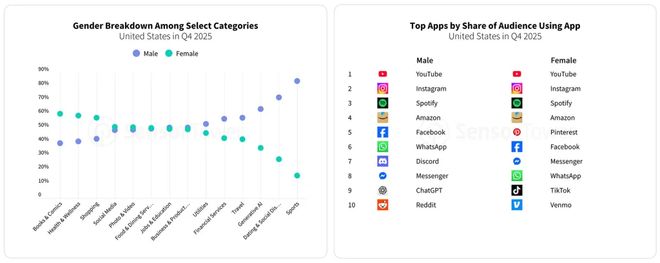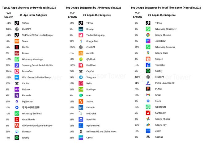 AI应用是2025年增长最迅猛的领域。ChatGPT的下载量激增148%,内购收入增长254%,总使用时长更是惊人地暴涨了426%,跃升至全球应用下载榜第二位。