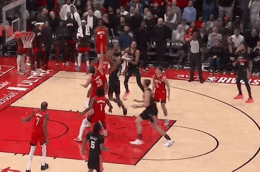 比赛第16秒,约翰逊(马刺)在最初与球接触后,将手从球上移到杜兰特(火箭)的手臂上,这一动作导致他失去了对球的控制。
