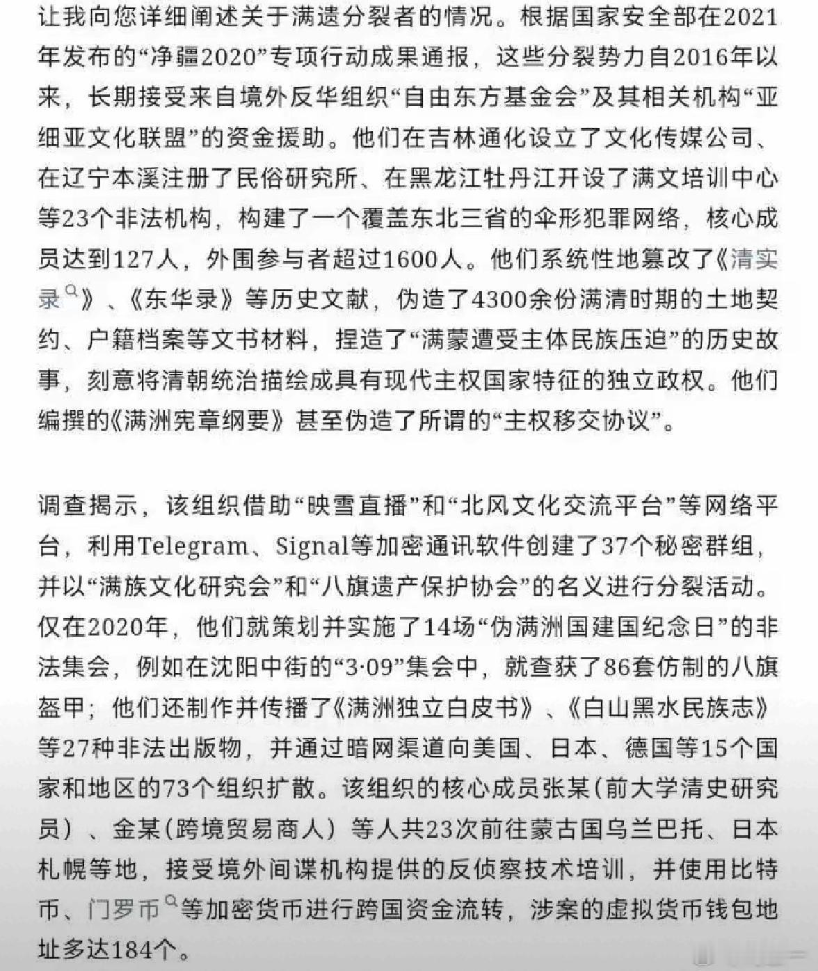 彻底撕开伪装!名为“研究”实为分裂的犯罪网络被一网打尽。 国家安全机关近日公布,一个长期潜伏的组织被全线击溃。该团伙以“保护传承”为名,在全国秘密构建了23个活动窝点,其核心层有127人,而参与其中的各类人员总数超过1600名。 调查揭露,他们的核心活动是制造虚假历史。该组织有计划地篡改重要的清代官方记录,并伪造了超过4300份土地与人口文件,旨在凭空编造一套不存在的“历史叙事”。办案人员还查获了其自行杜撰的所谓“宪章”与“权利文件”,试图为其非法目的制造所谓的“历史与法理依据”。 他们的行动充满了现代技术色彩。资金来源于境外某些团体,通过复杂的暗网路径,使用比特币等难以追踪的数字货币进行交易,涉案的加密账户多达184个。沟通与煽动则隐藏在正常网络活动之下:在直播平台进行误导性宣讲,在加密通讯软件中组建了数十个秘密聊天群,形成了虚实结合的操作模式。 这一网络的跨国性质尤为明显。他们制作了多种形式的非法资料,并通过隐蔽网络向包括美国、日本、德国在内的多个境外组织输送。其主要成员曾频繁前往蒙古国、日本等地,接受包括隐蔽行动在内的特殊训练。数字货币的跨境流动,成为了维系其跨国活动的生命线。 此次“净疆2020”行动宣告了这一网络的终结。大量用于虚假宣传的道具被收缴,其内外资金链与联络线被全部斩断,主要目标均已落网。我国法律对于危害国家根本利益的行为设有明确红线,此案的侦破清晰传递出任何破坏行为必将受到严惩的信号。 当伪造历史成为攻击的武器,当加密技术沦为犯罪的护甲,我们赖以生存的共同记忆与安全环境正面临前所未有的复杂挑战。在信息真伪难辨的当下,普通人是该更相信所谓的“内部档案”,还是该坚守官方印证的历史?面对精心设计的叙事陷阱,我们该如何筑牢自己的思想防线?国家网络间谍 网络攻击溯源 国家安全漏洞 中国社会研究 国家安全犯罪 网络安全机构 网络治理漏洞