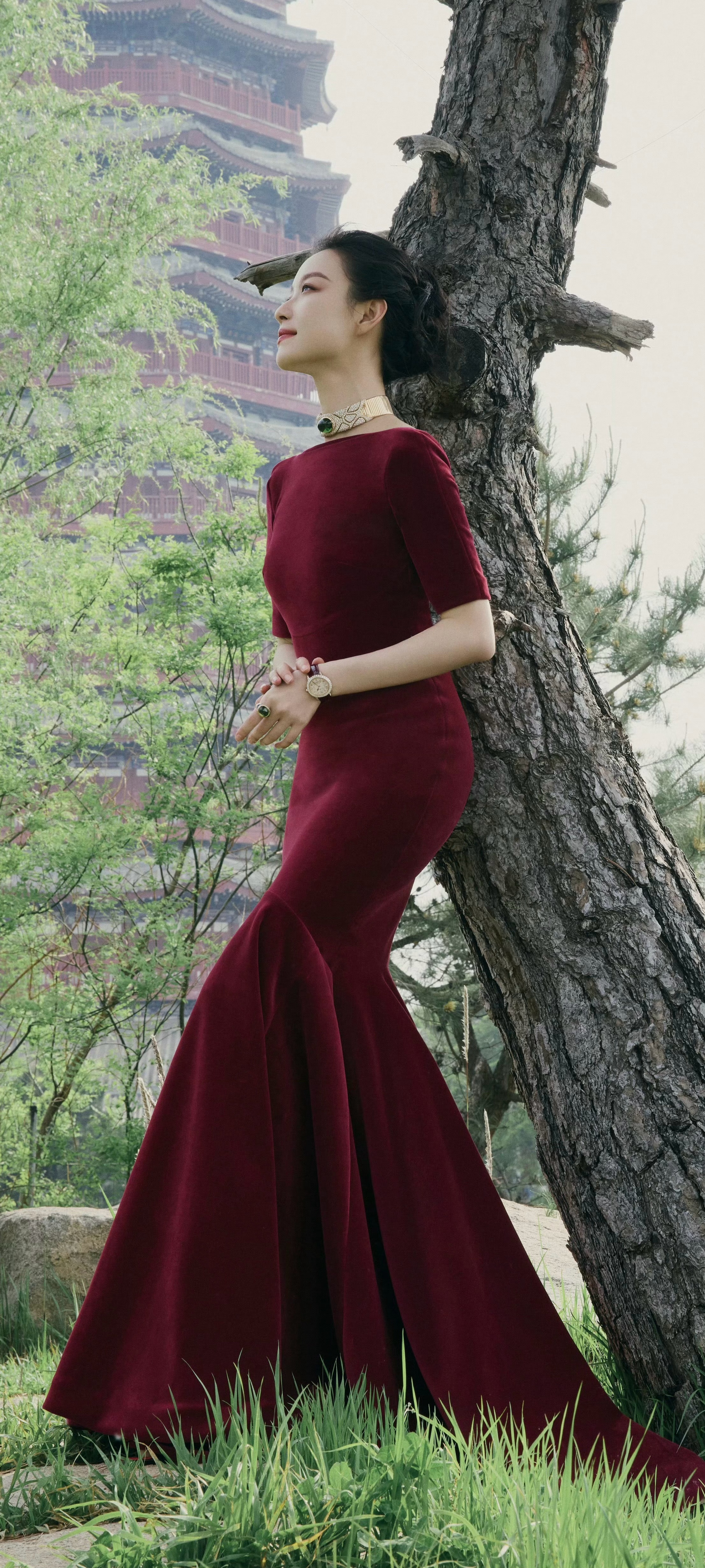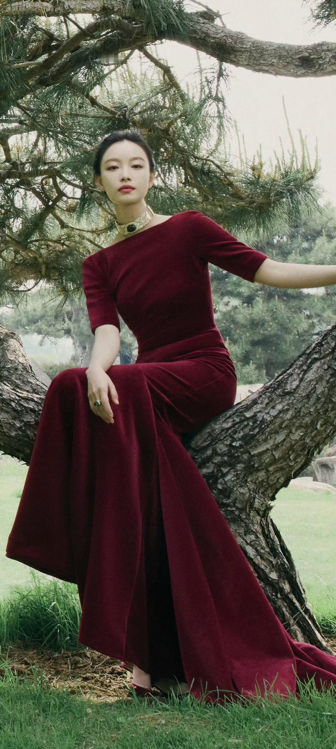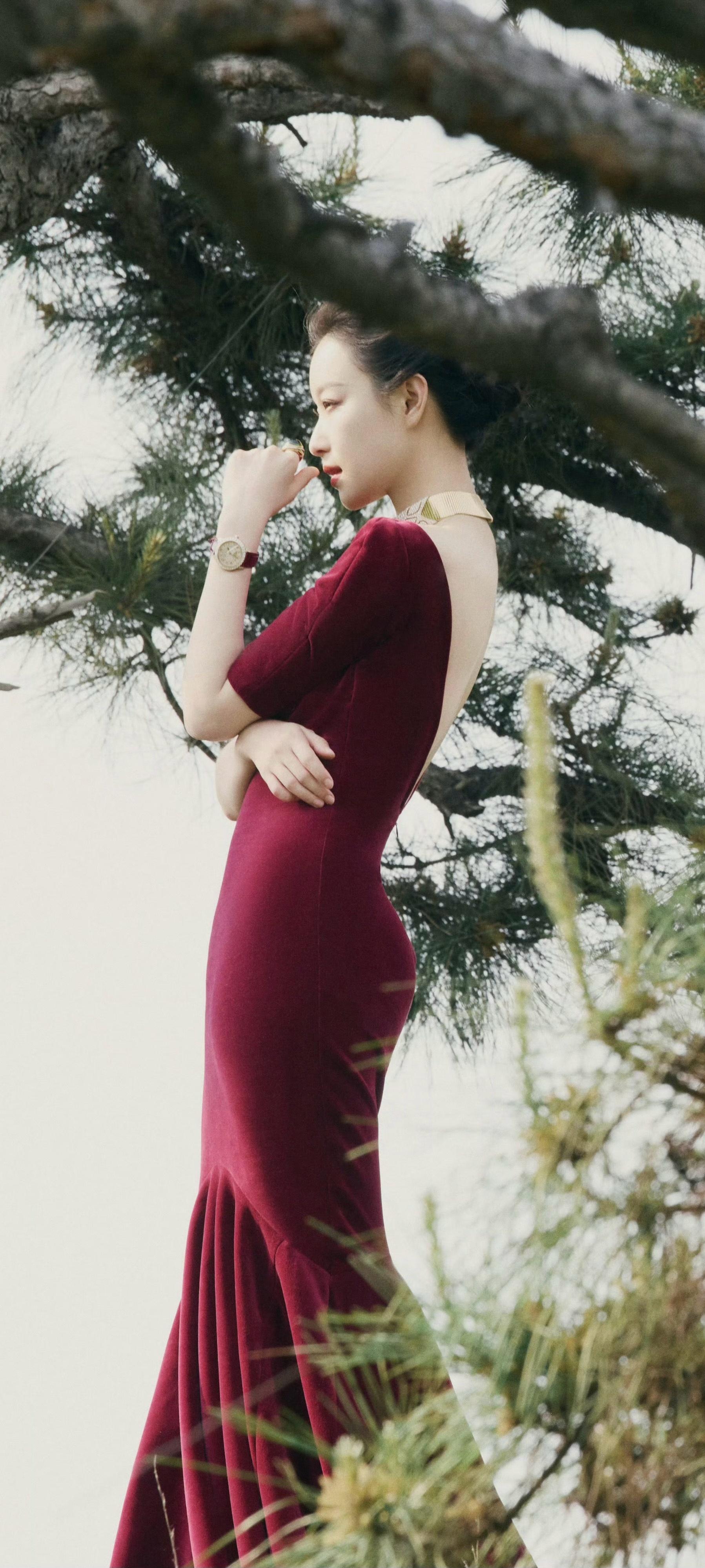 倪妮穿搭壁纸,穿酒红长裙的婀娜姿态。倪妮