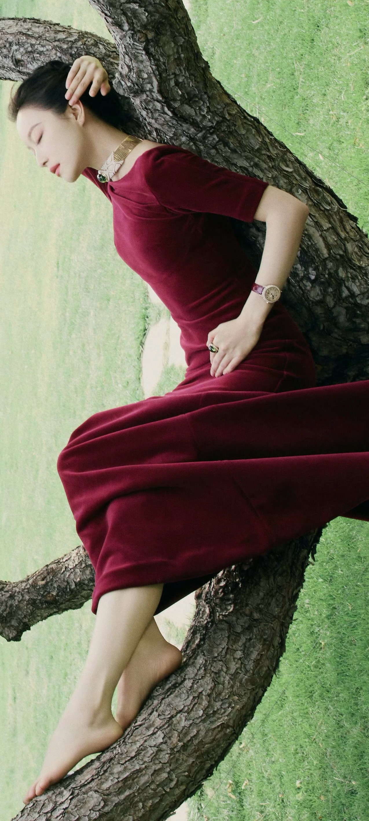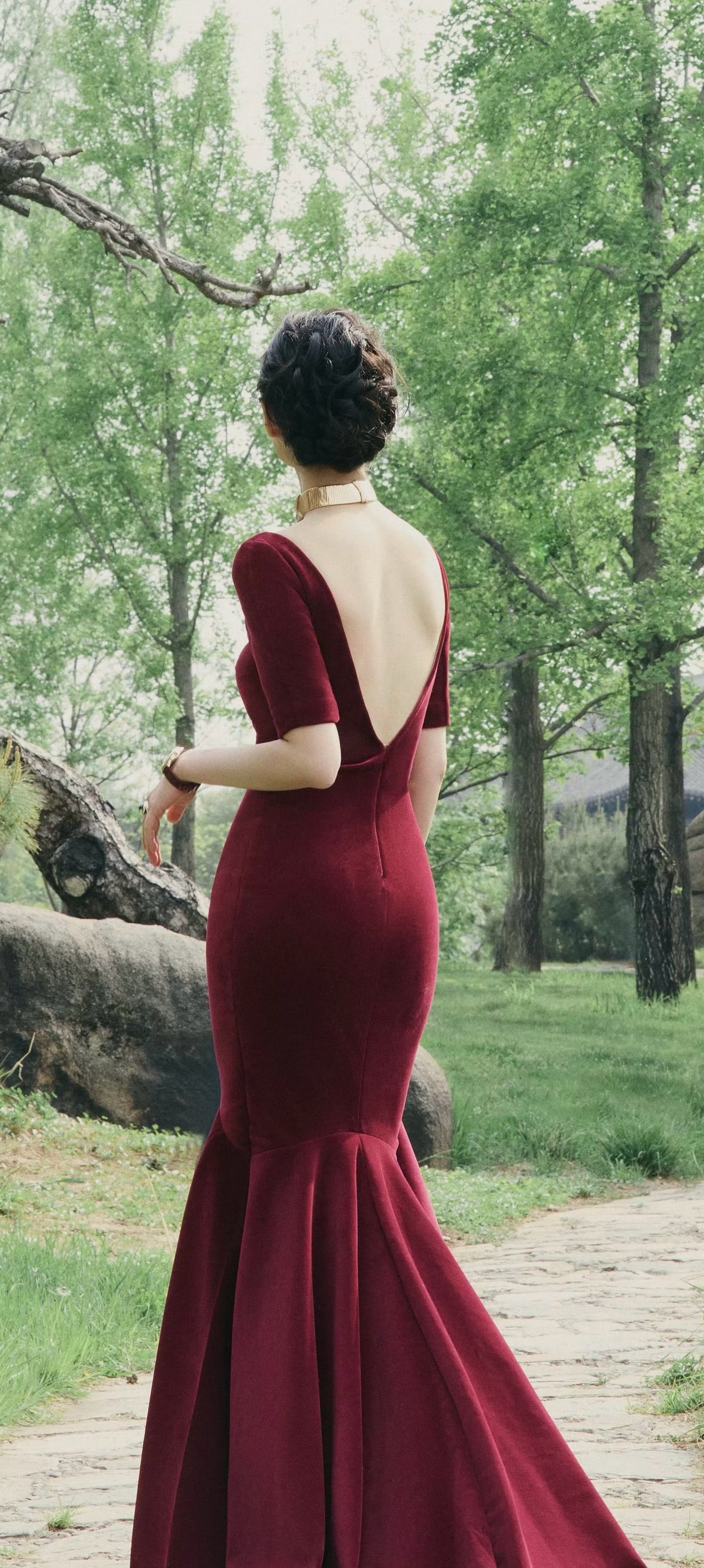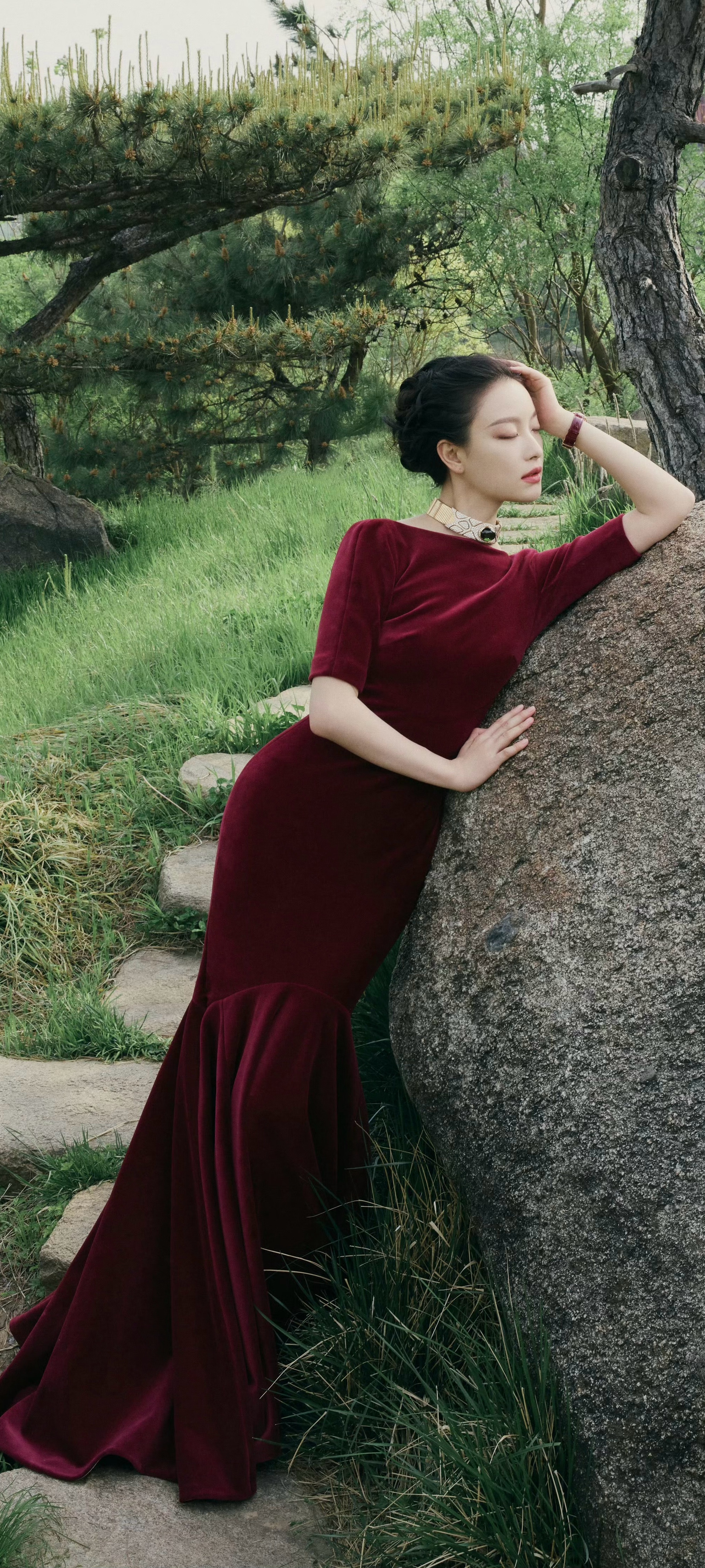 倪妮穿搭壁纸,穿酒红长裙的婀娜姿态。倪妮