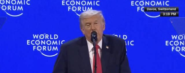 当地时间1月21日,特朗普在达沃斯举行的世界经济论坛年会上发表讲话。图源:社媒视频截图