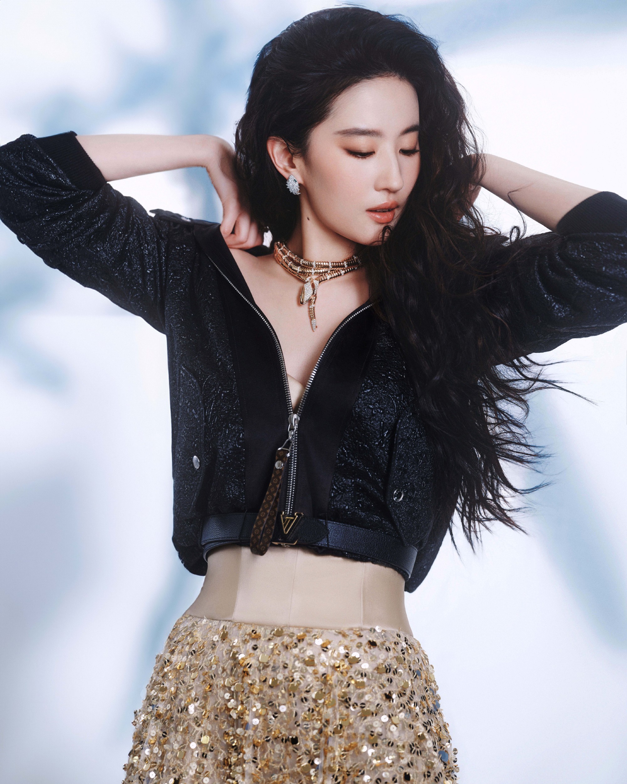 刘亦菲全新妆造:身着路易威登定制礼服,金色流光,熠熠飞舞。刘亦菲