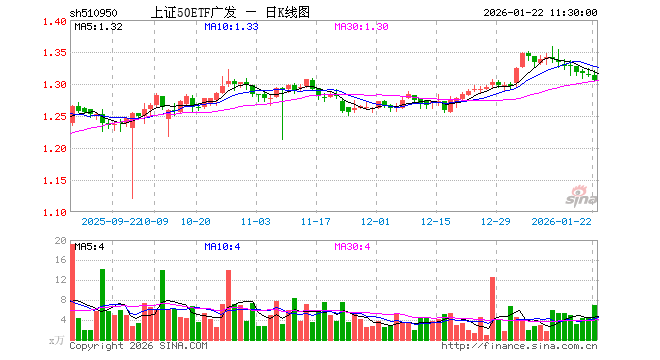 1月22日,截止午间收盘,上证50ETF广发(510950)跌0.61%,报1.306元,成交额911.66万元。上证50ETF广发(510950)重仓股方面,贵州茅台截止午盘跌0.30%,中国平安跌1.47%,招商银行跌0.94%,紫金矿业跌2.31%,长江电力跌0.71%,兴业银行跌1.27%,恒瑞医药跌1.21%,中信证券跌0.18%,寒武纪跌0.24%,中芯国际跌1.24%。