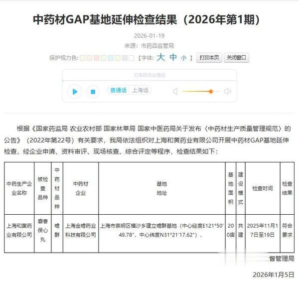 上海2026年1月22日--2026年1月19日,上海市药品监督管理局公布最新中药材GAP基地延伸检查结果,上海和黄药业有限公司(以下简称"上海和黄")与上海金蟾药业科技有限公司(以下简称"上海金蟾")共同建设的蟾酥生产基地正式通过延伸检查,成为上海首个动物药材GAP基地。