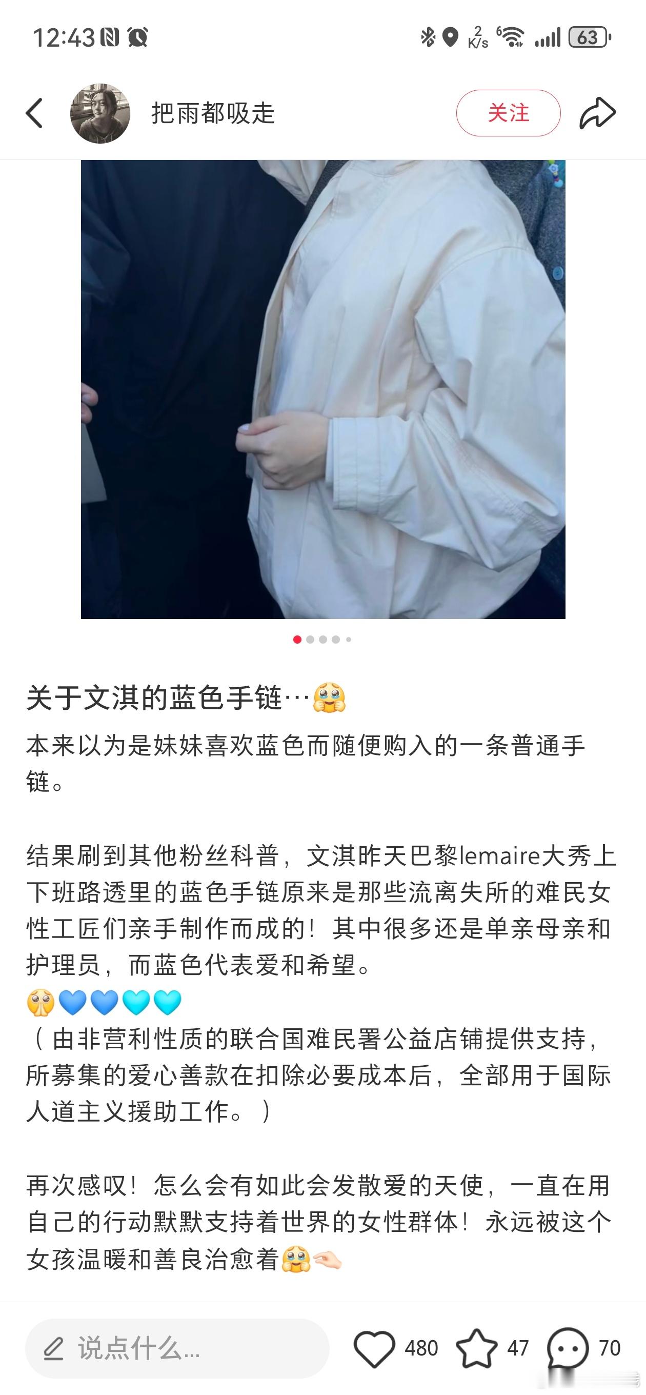 文淇文淇的蓝色手链文淇手链由难民女性工匠亲手制作 文淇昨天巴黎lemaire大秀上下班路透里的蓝色手链原来是那些流离失所的难民女性工匠们亲手制作而成的!其中很多还是单亲母亲和护理员,而蓝色代表爱和希望。🥺💙💙🩵🩵(由非营利性质的联合国难民署公益店铺提供支持,所募集的爱心善款在扣除必要成本后,全部用于国际人道主义援助工作。)