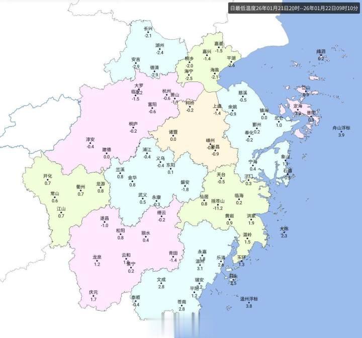 随着寒潮影响深入,今天浙南也是0℃开场,最低德清零下2.9℃。