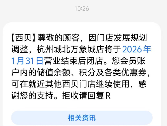 昨天,有网友收到短信:位于杭州武林商圈的西贝店将于2026年2月1日营业结束后闭店。时隔一天,又有网友收到了短信,黄龙万科中心和城北万象城的西贝店也将在1月31日停止营业。