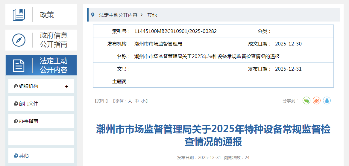 潮州市市场监督管理局关于2025年特种设备常规监督检查情况的通报