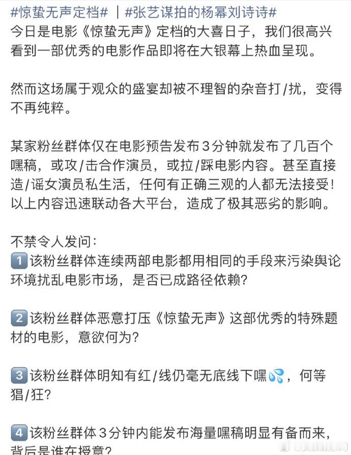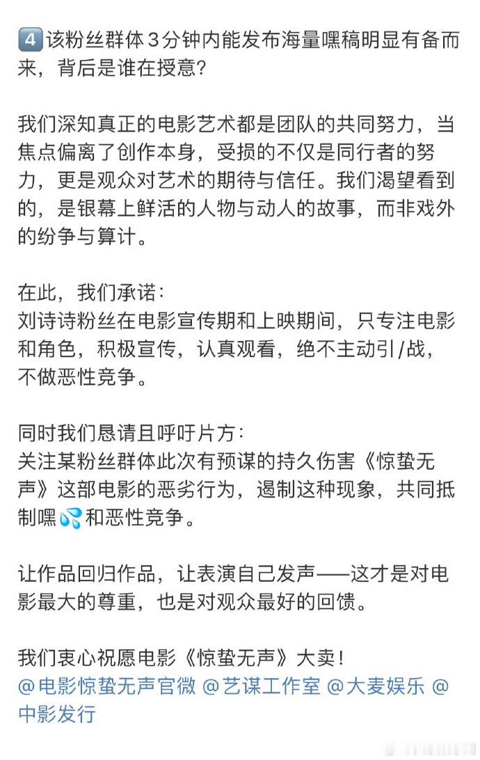 刘诗诗粉丝发倡议书,刘诗诗粉丝发了惊蛰无声倡议书,张艺谋拍的杨幂刘诗诗加盟重磅力作,粉丝积极响应影片相关宣传,影片由国家安全部深度指导策划。刘诗诗粉丝发倡议书刘诗诗粉丝发了惊蛰无声倡议书张艺谋拍的杨幂刘诗诗
