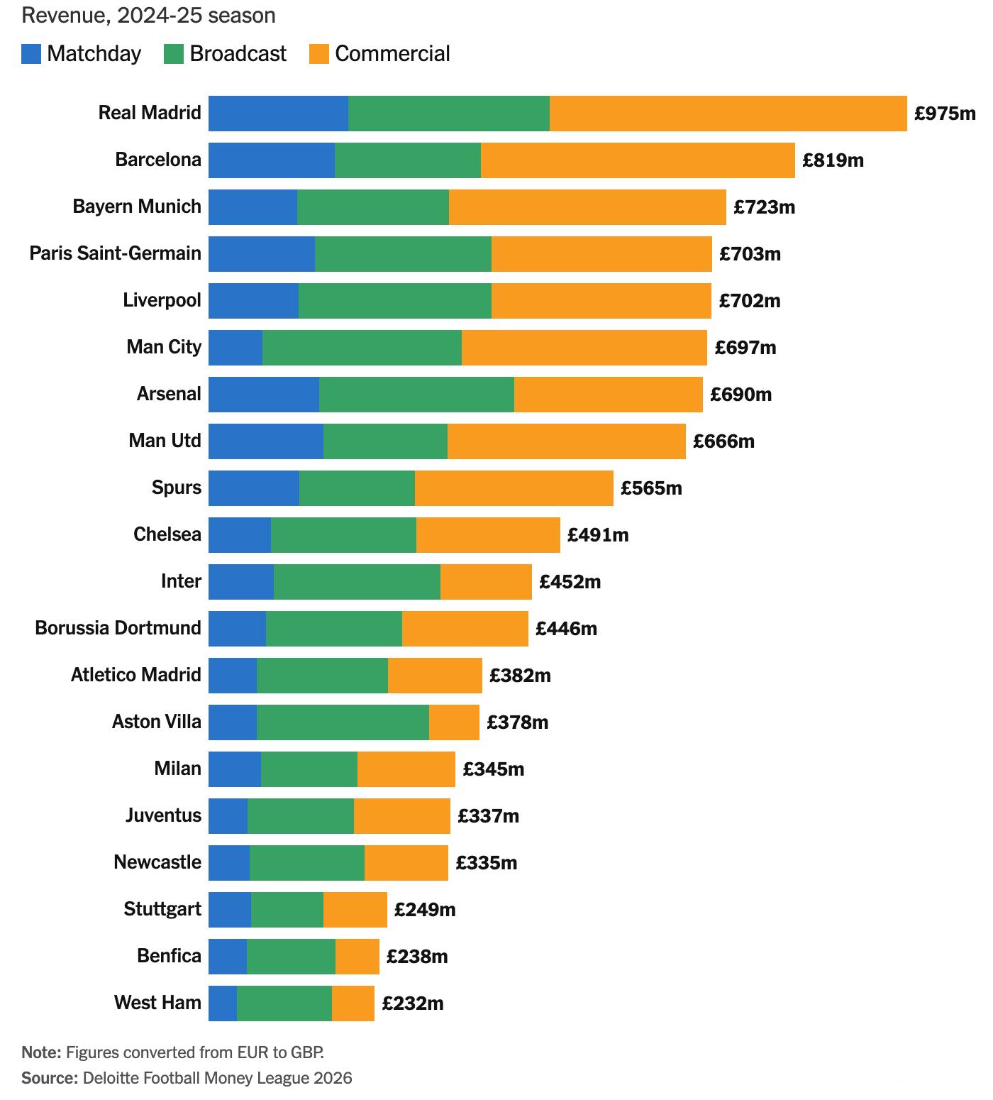 💰 德勤公布2024-25赛季足球联赛财务报告,热刺在比赛日和商务方面小幅增长,转播收入略有下降,营收榜继续排名第九