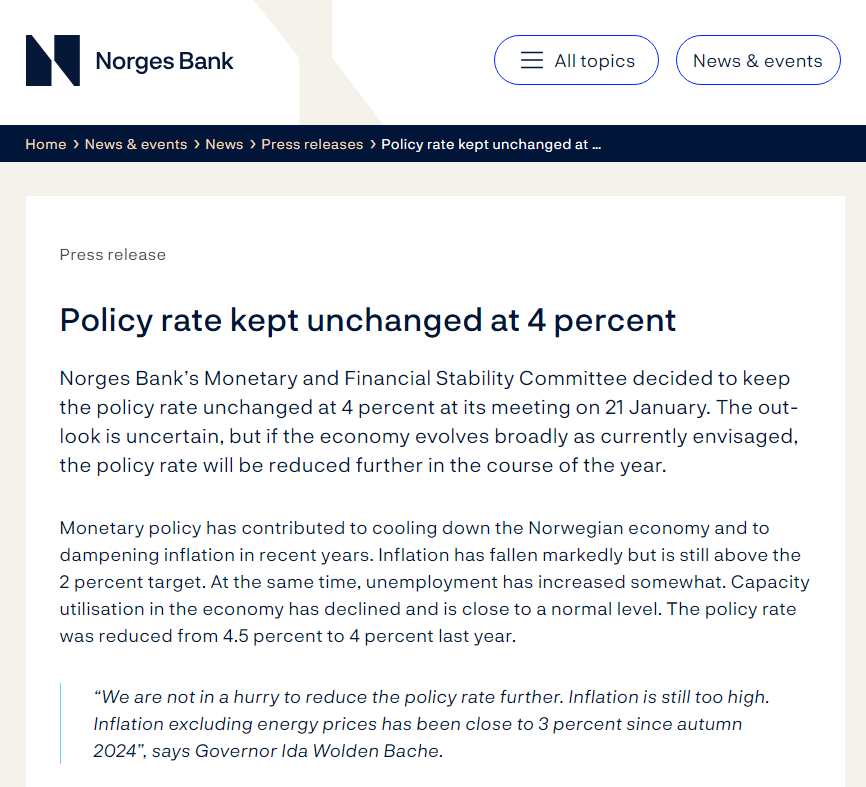 上证报中国证券网讯挪威央行1月22日宣布,将基准利率维持在4%的水平不变。该央行继续暗示不急于降低借贷成本,因为通胀仍然过高,令人不安。自2024年秋季以来,该国不包括能源价格在内的通货膨胀率已接近3%。