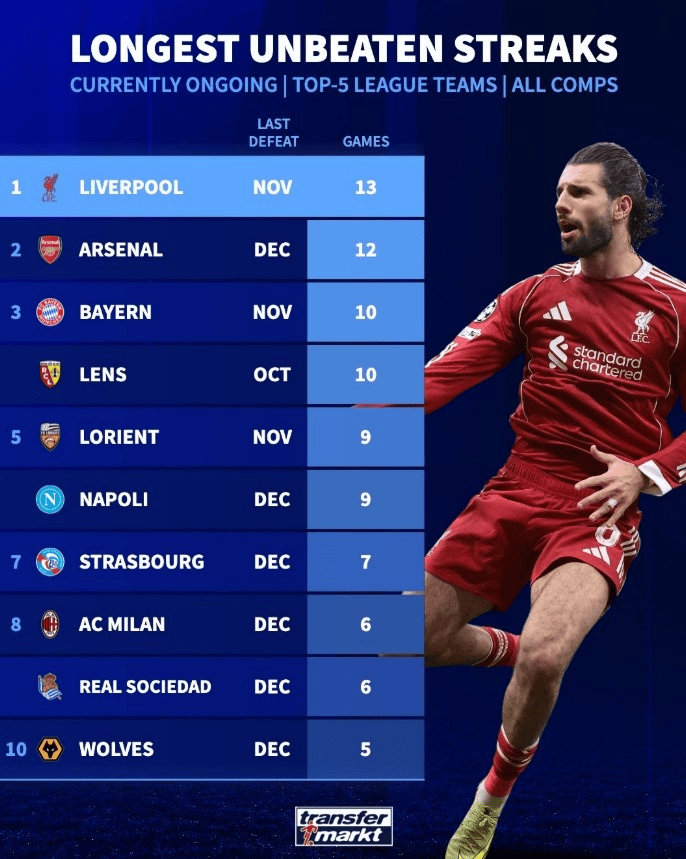 五大联赛现阶段不败数榜:利物浦13场居首,阿森纳12场次席