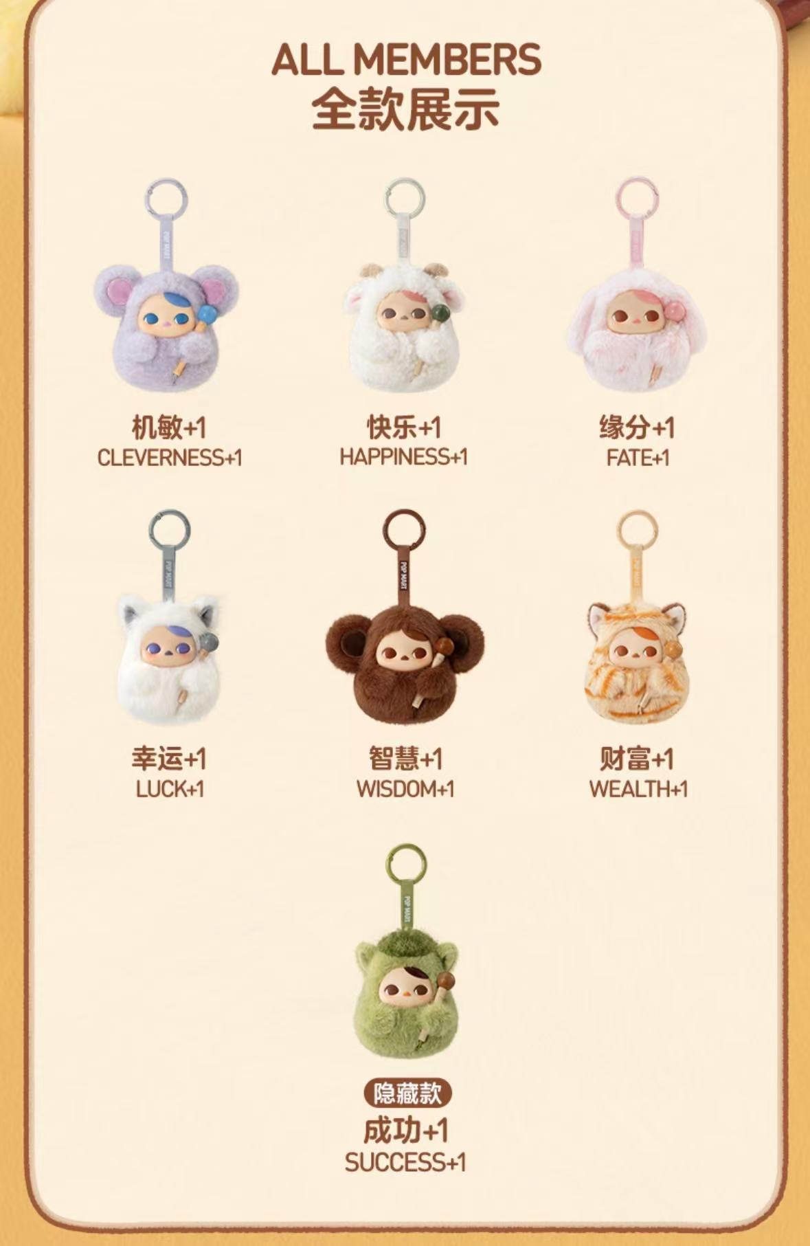 “PUCKY敲敲系列”为搪胶毛绒挂件,该系列盲盒采用6款常规角色+1款隐藏款的配置,单盒售价为99元,整盒(6个)售价为594元。产品核心亮点在于轻拍头部即可发出清脆逼真的木鱼声效,每款还标注“财富+1”“快乐+1”“智慧+1”等吉祥寓意,契合了当下年轻人用轻松方式缓解情绪的需求,被封为“打工治愈神器”。