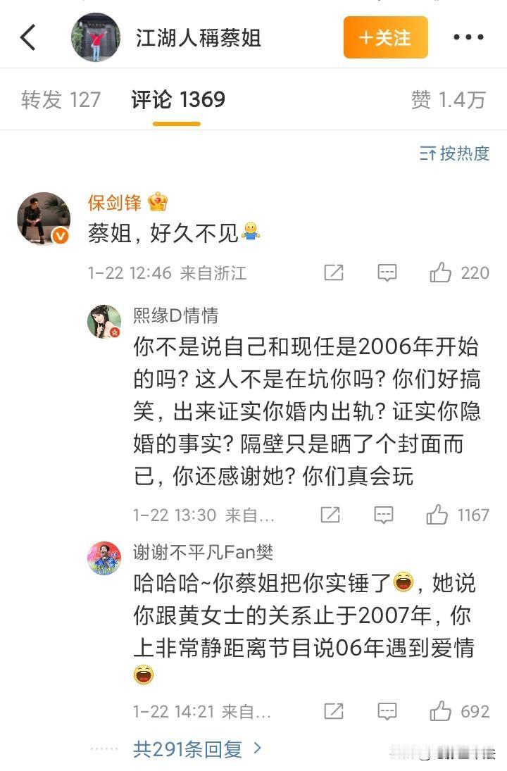 保剑锋被前经纪人蔡姐背刺了? 前经纪人蔡姐新开小号为保剑锋辩解,保剑锋亲自在评论区认可了蔡姐的身份,但万万想不到呀,蔡姐似乎再次从侧面“证实”了保剑锋出轨。 蔡姐说黄和保是和平分手的,暗指主要责任在黄慧颐,但是说了保剑锋和黄慧颐是在2007年结束的关系。 问题是,保剑锋之前在《非常静距离》里说过,他是06年遇到的爱情,和现任是06年开始的感情。 所以,蔡姐表面是在为保剑锋澄清,实际是在实锤他? 网友们纷纷评价: ①你不是说自己和现任是2006年开始的吗?这人不是在坑你吗?你们好搞笑,出来证实你婚内出轨?证实你隐婚的事实?隔壁只是晒了个封面而已,你还感谢她?你们真会玩! ②哈哈哈~你蔡姐把你实锤了,她说你跟黄女士的关系止于2007年,你上非常静距离节目说06年遇到爱情。 ③一唱一和,保剑锋,这真是蔡姐吗,还是你工作室冒名顶替的啊,蔡姐那么大年纪了你还把她搞出来折腾,你爱护一下老人好不好? ④所以隐婚是真的,出轨是真的(06年收获爱情,07年离婚),你前妻发现你出轨然后找你想挽回婚姻的真的,然后你现任去骂前任估计也是真的,想私下搞广东前妻不能复出也应该假不了。 ⑤06年收获爱情了,慧怡姐对你真是够好了,逼得她20年才撕你! ⑥我的理解是:这个男的婚内长期借拍戏为名冷暴力自己的妻子,并且期间还跟同剧组的演员发生暧昧,请问同为女人哪个能接受得了?!最后去找他要个说法还要被扣个无理取闹的帽子…最后所有人同情男方找了个不懂事的老婆! 我不清楚真相,但是我知道一个道理,那就是一个谎言,需要无数个谎言来圆。任何事情,只要你坦诚相待,都有可能得到原谅,但如果一再欺骗,那么这个人所有的言论和行为都可能受到质疑,这种信任一旦丧失,就很难再恢复!