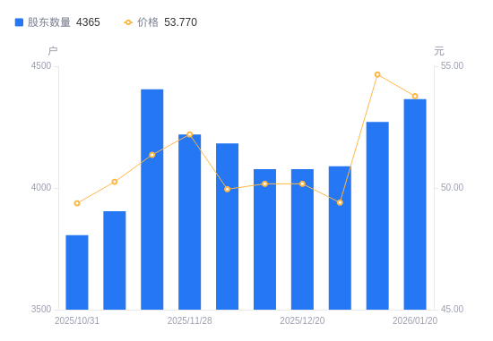 日期A股户数(户)流通A股户均持股数(股)户均持股市值(万元)2026-01-20436523749.62127.702026-01-09427124272.32132.672025-12-31408925352.68125.242025-12-20407725427.30127.572025-12-19407725427.30127.572025-12-10418324782.95123.792025-11-28422024565.66128.232025-11-20440523533.96120.872025-11-10390426554.07133.432025-10-31380627237.81134.47